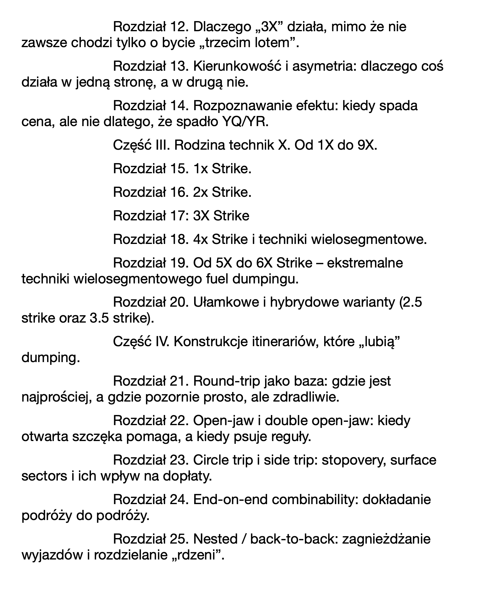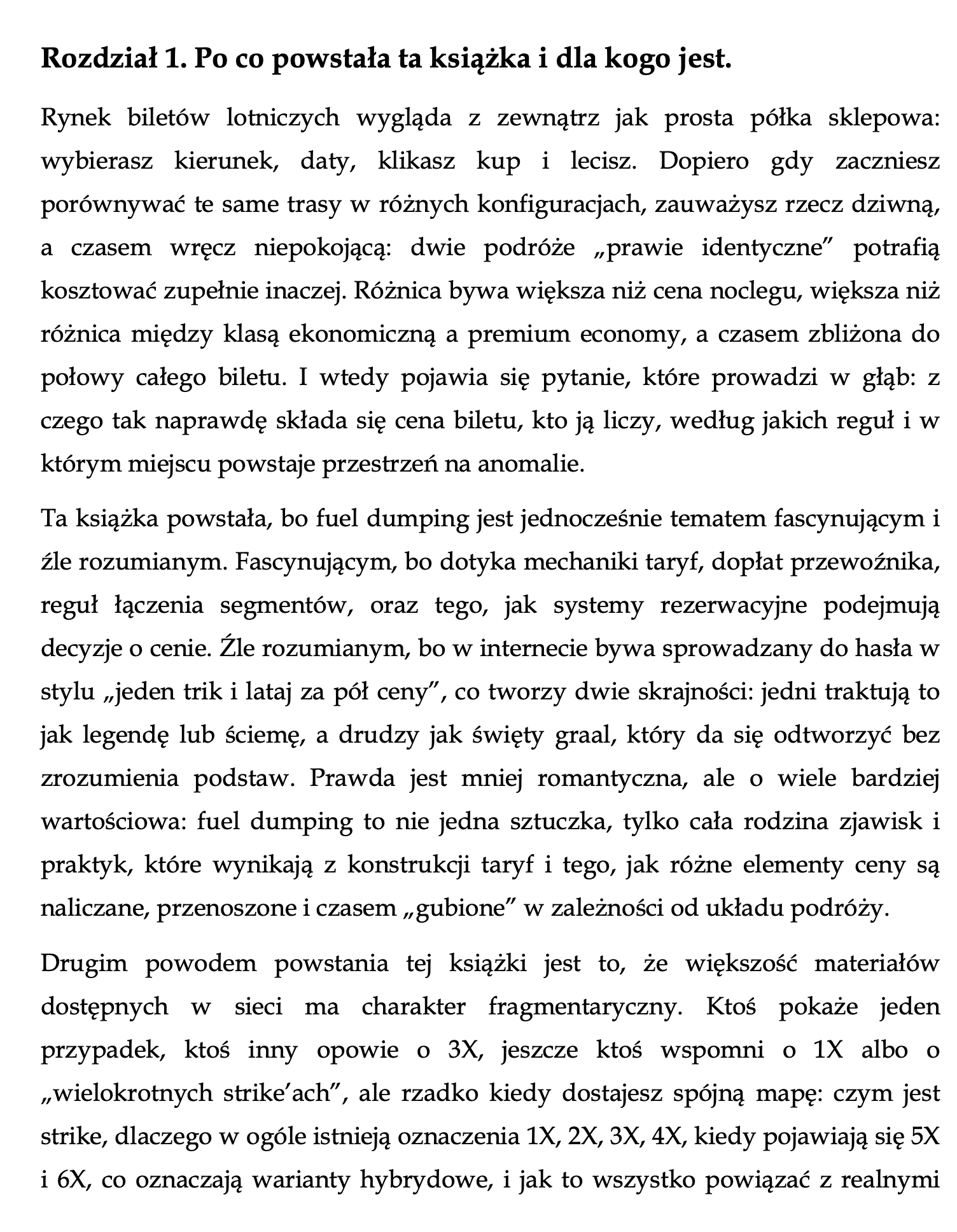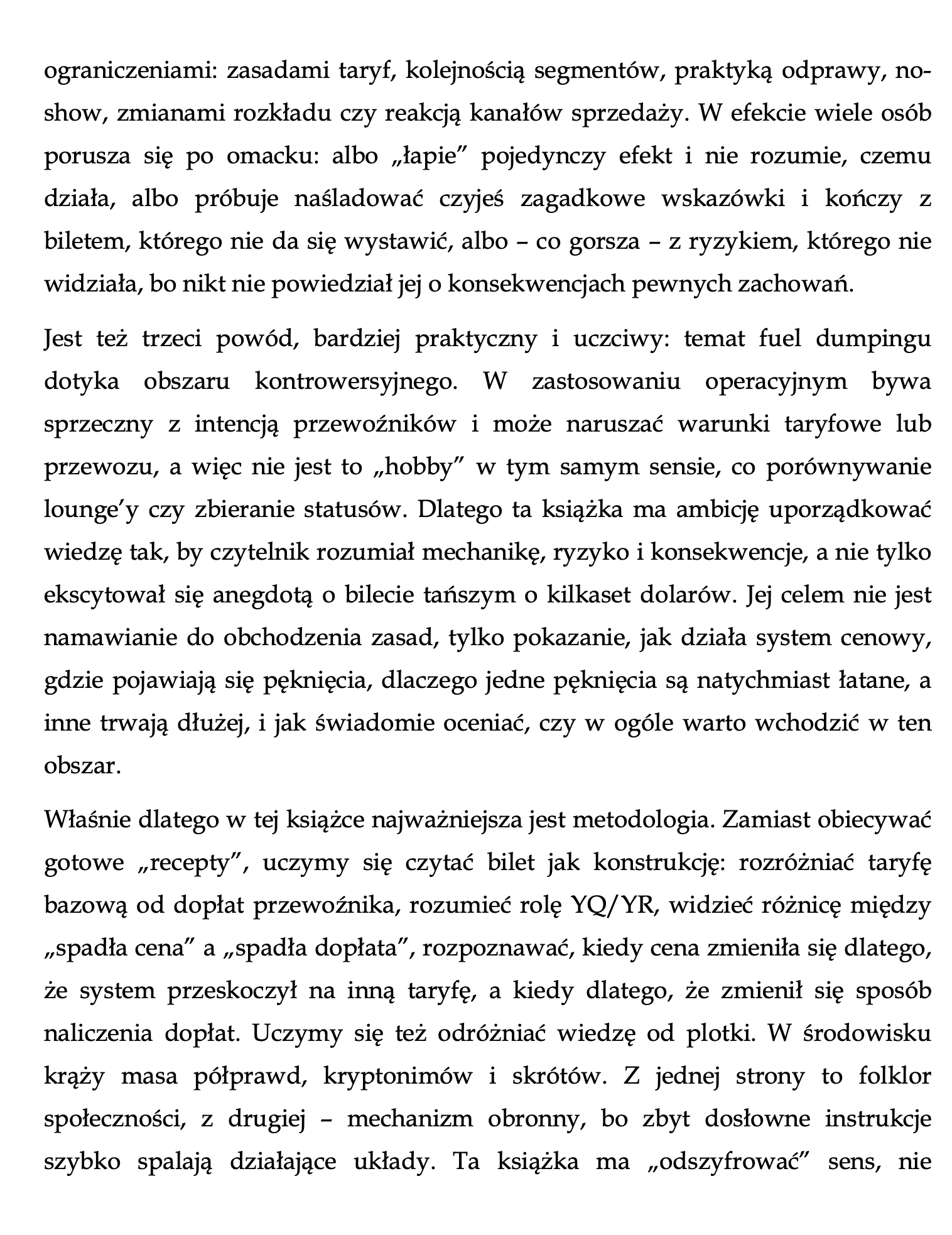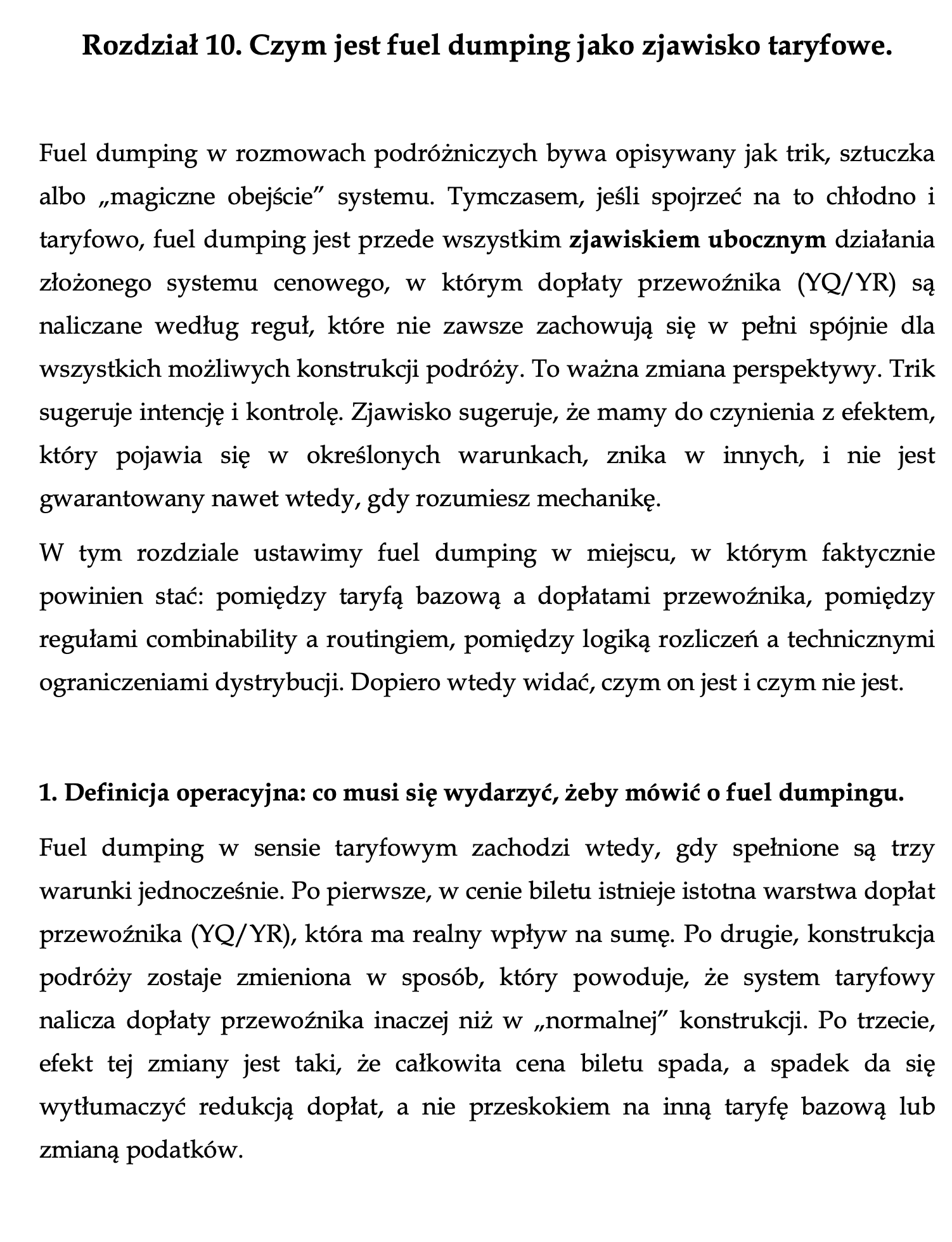 W centrum stoi zjawisko nazywane „fuel dumpingiem”, czyli sytuacjami, w których końcowa cena biletu spada nie dlatego, że linia „dała promocję”, ale dlatego, że w określonej konstrukcji itinerarium zmienia się sposób naliczania dopłat przewoźnika. Książka wyjaśnia różnicę między taryfą bazową, podatkami i dopłatami YQ/YR, a następnie pokazuje, jak niewielkie zmiany w trasie, doborze przewoźników albo kolejności segmentów potrafią wywołać duży efekt cenowy.
