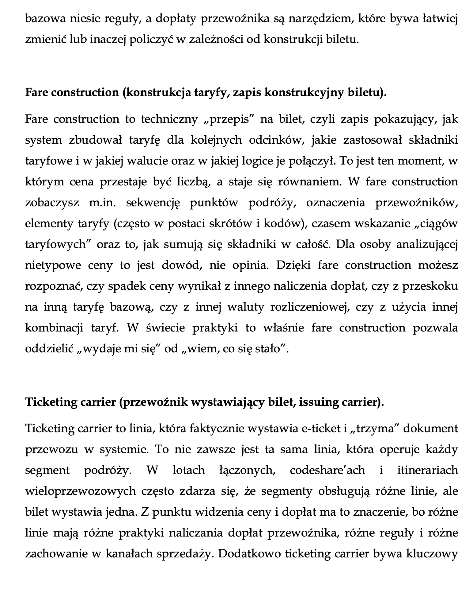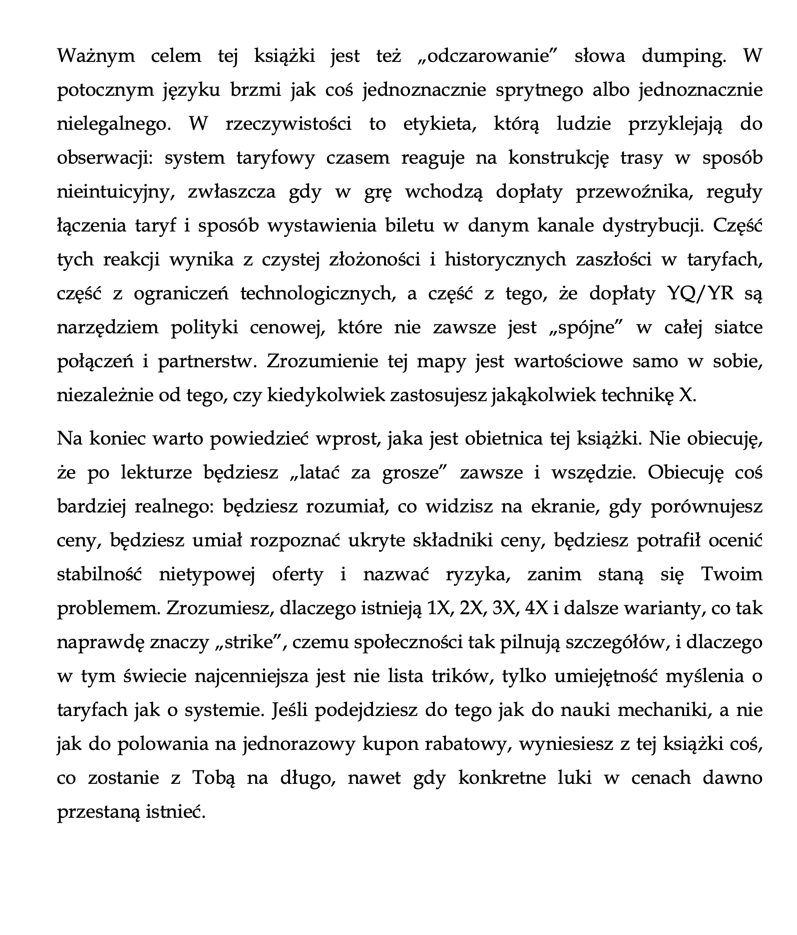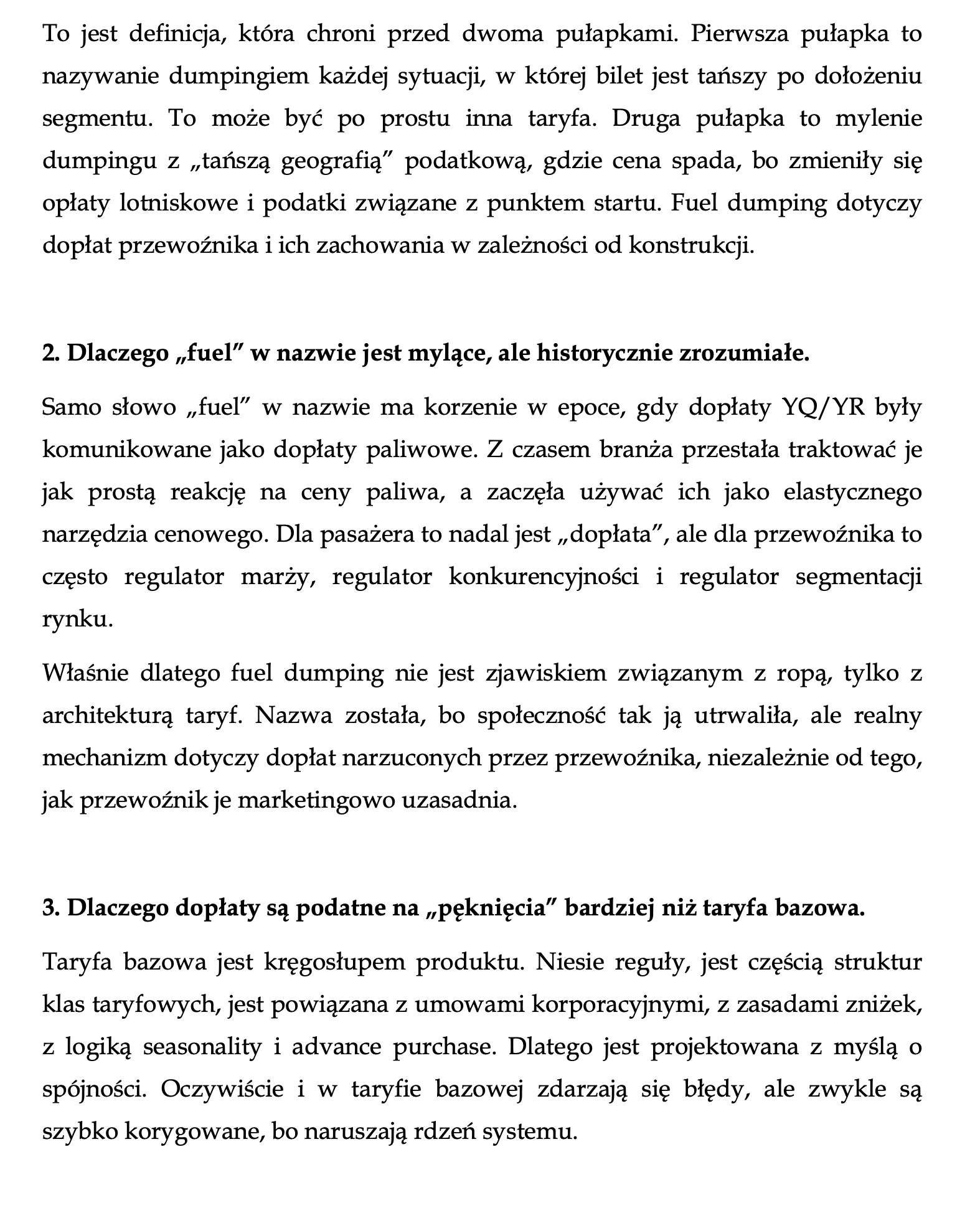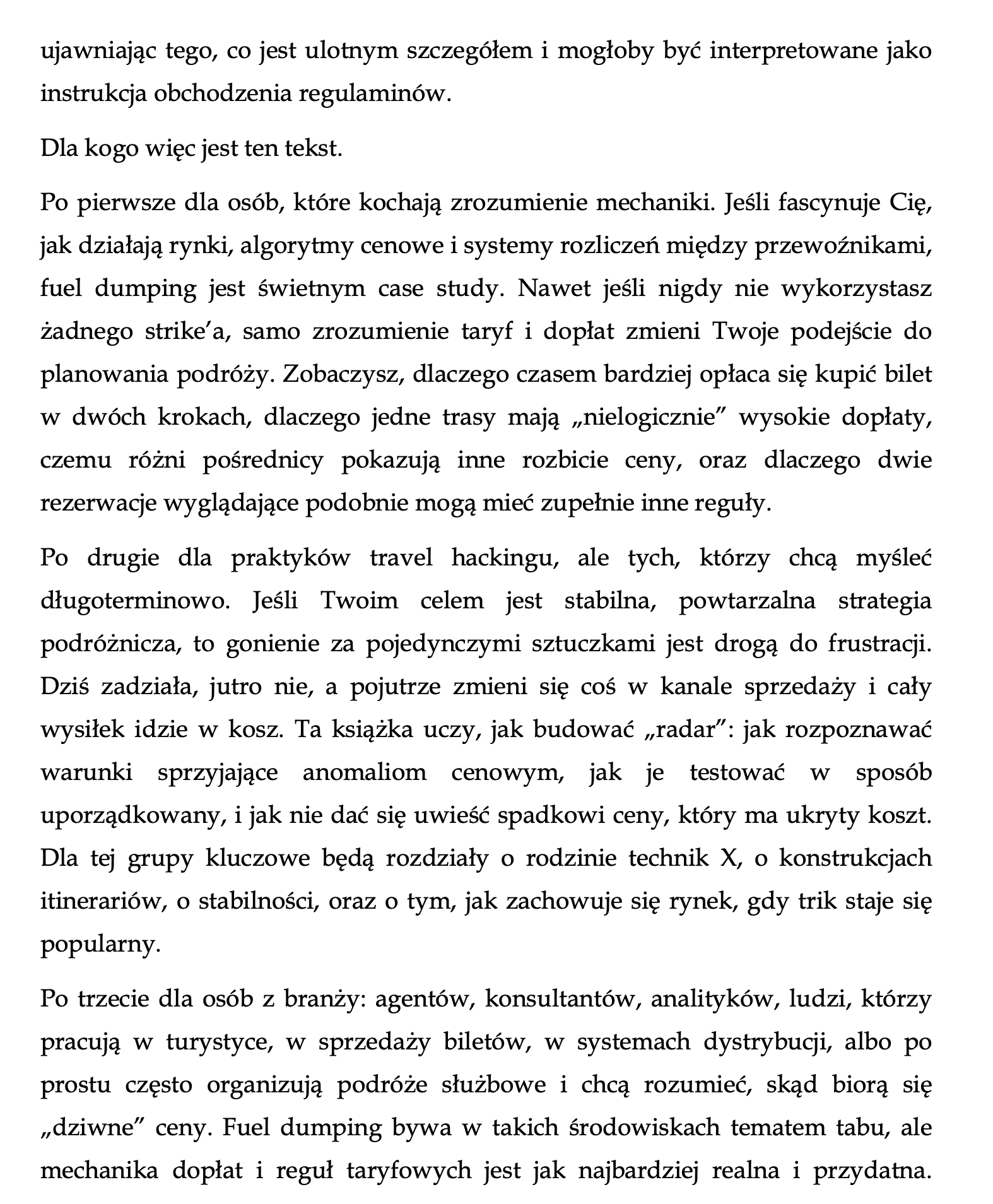 W centrum stoi zjawisko nazywane „fuel dumpingiem”, czyli sytuacjami, w których końcowa cena biletu spada nie dlatego, że linia „dała promocję”, ale dlatego, że w określonej konstrukcji itinerarium zmienia się sposób naliczania dopłat przewoźnika. Książka wyjaśnia różnicę między taryfą bazową, podatkami i dopłatami YQ/YR, a następnie pokazuje, jak niewielkie zmiany w trasie, doborze przewoźników albo kolejności segmentów potrafią wywołać duży efekt cenowy.