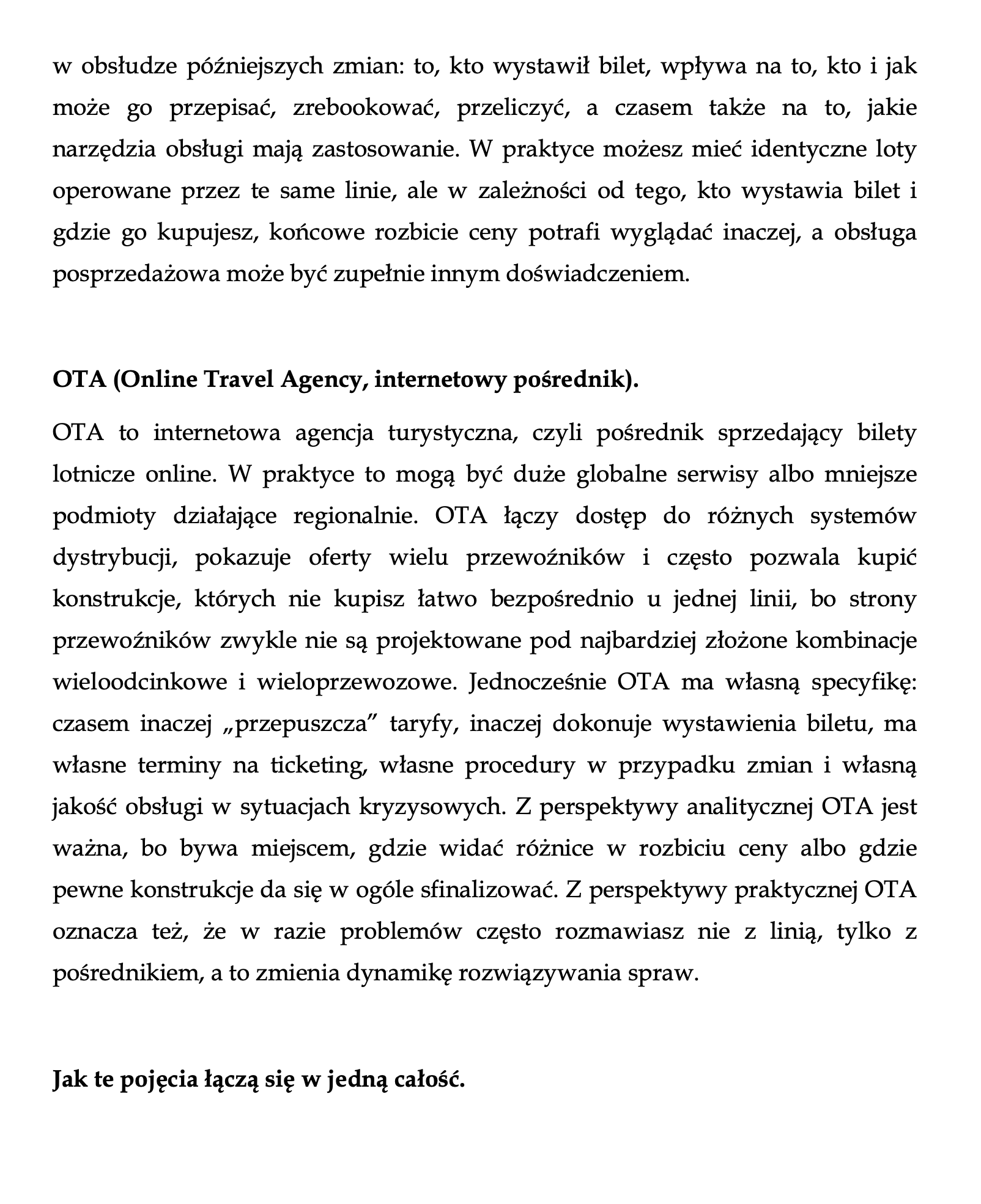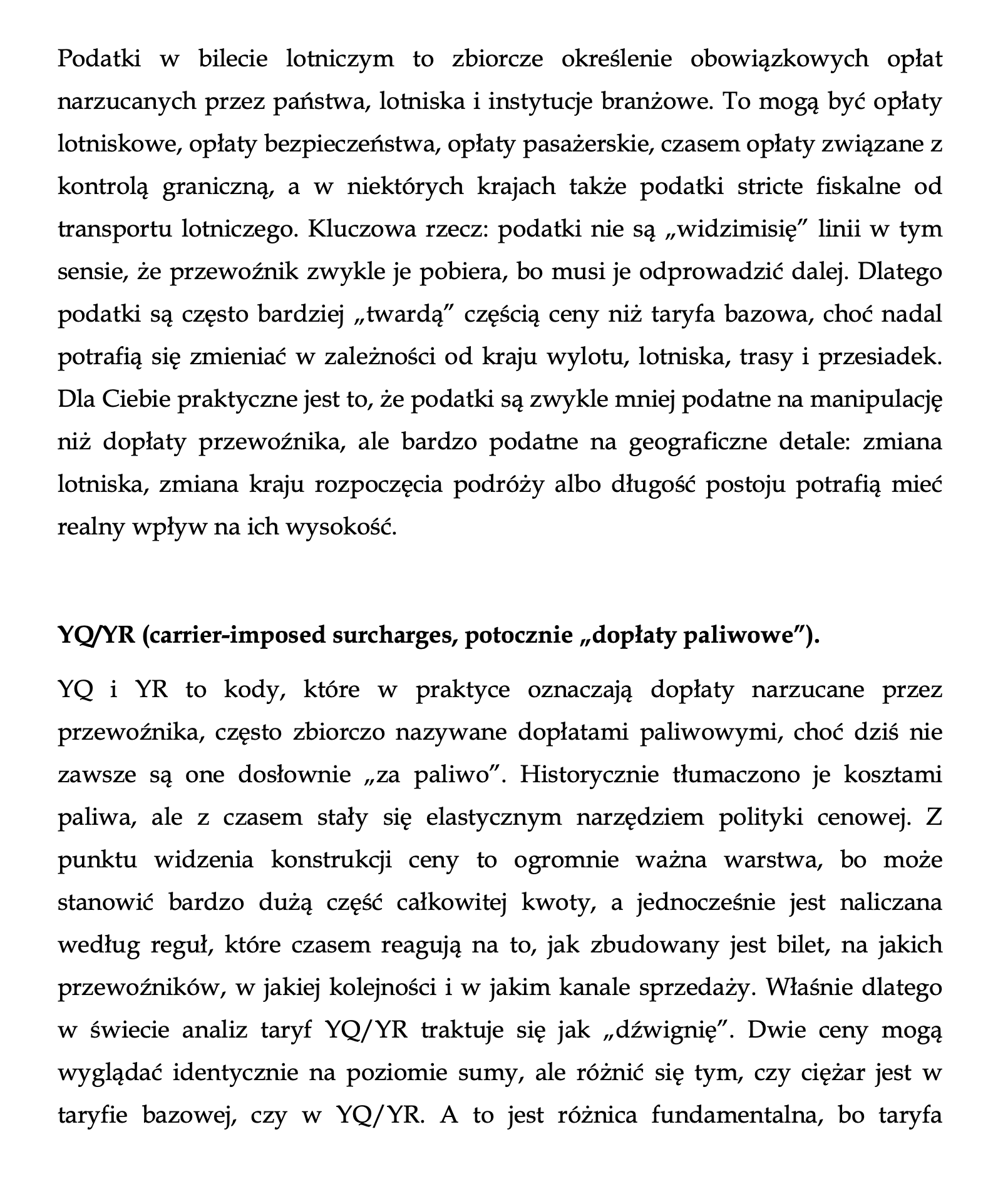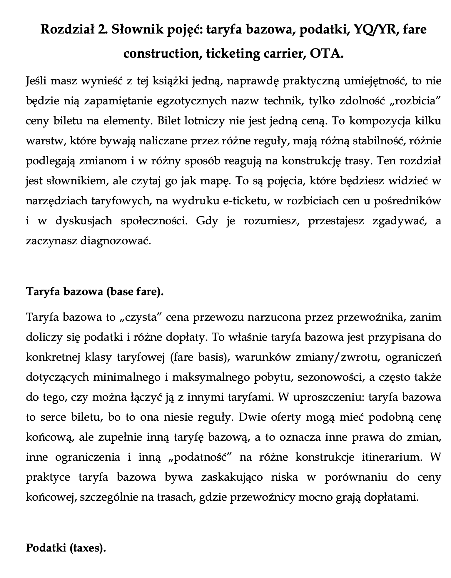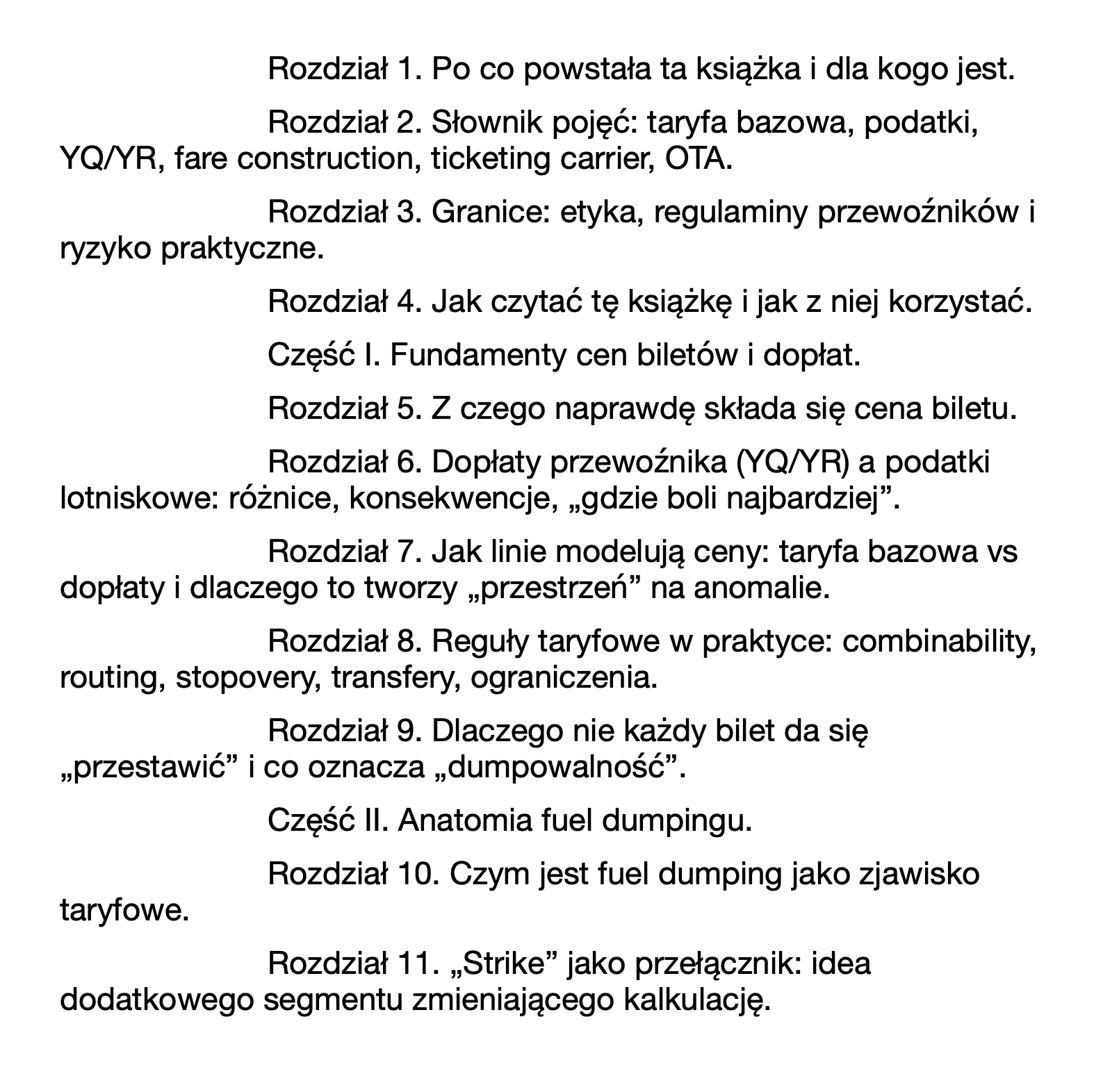 W centrum stoi zjawisko nazywane „fuel dumpingiem”, czyli sytuacjami, w których końcowa cena biletu spada nie dlatego, że linia „dała promocję”, ale dlatego, że w określonej konstrukcji itinerarium zmienia się sposób naliczania dopłat przewoźnika. Książka wyjaśnia różnicę między taryfą bazową, podatkami i dopłatami YQ/YR, a następnie pokazuje, jak niewielkie zmiany w trasie, doborze przewoźników albo kolejności segmentów potrafią wywołać duży efekt cenowy.