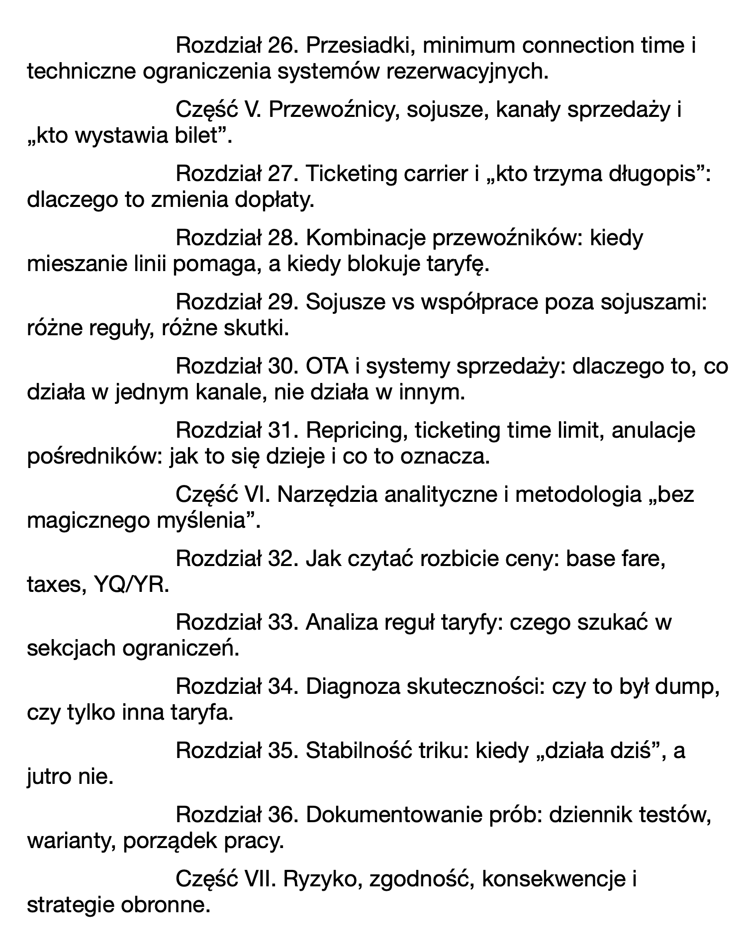 Po przeczytaniu tej książki przestaniesz patrzeć na bilet jak na jedną liczbę. Zobaczysz strukturę: co jest kosztem bazowym, co jest podatkiem, a co jest dopłatą przewoźnika – i co w danym przypadku faktycznie się zmieniło. Nauczysz się rozpoznawać, czy spadek ceny wynika z efektu na dopłatach, czy z przeskoku taryfowego. Nauczysz się projektować trasę tak, żeby była nie tylko tania, ale też wykonalna i stabilna. A przede wszystkim: dostaniesz procedury, które pomogą Ci podejmować decyzje świadomie, z planem awaryjnym, zamiast liczyć na szczęście.