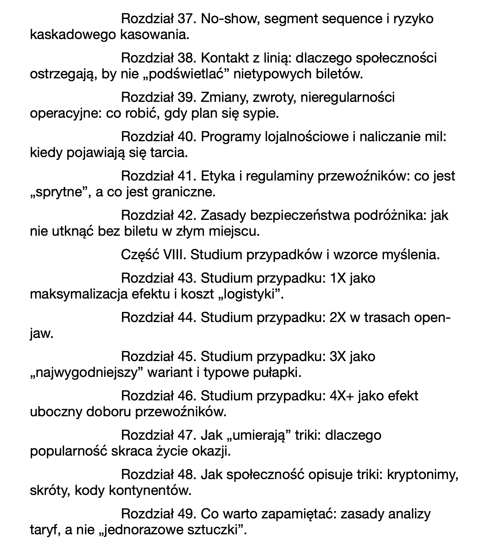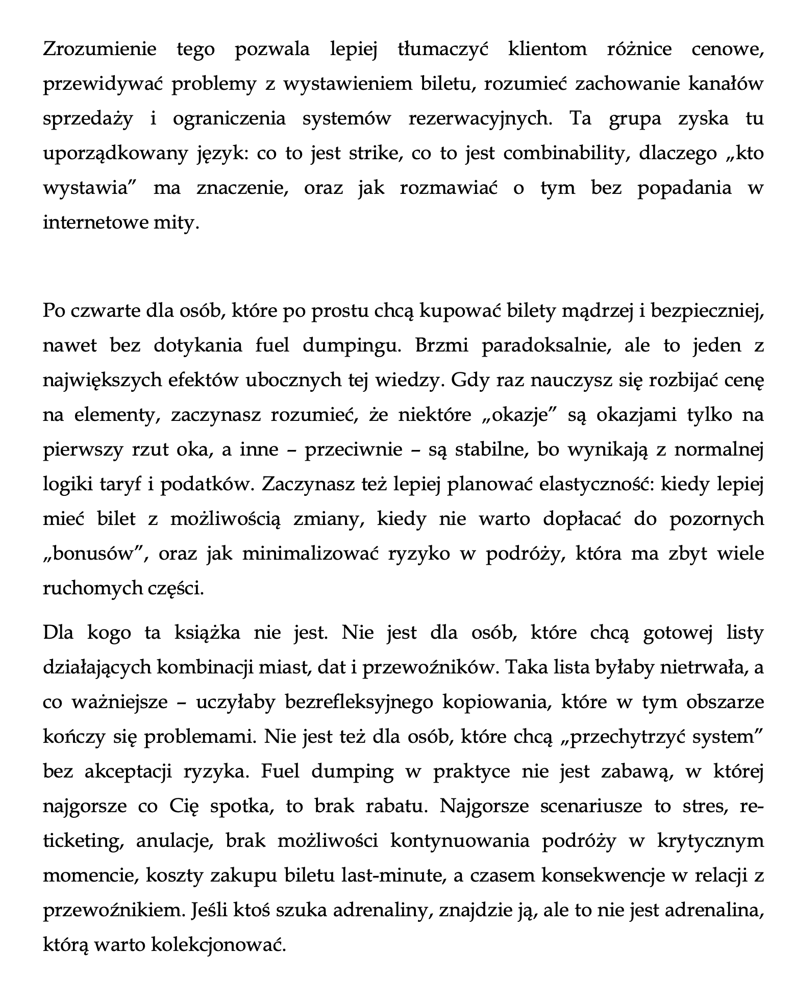 Największą siłą „Fuel Dumping bez tajemnic” jest dojrzałość podejścia. Autor nie sprzedaje mitu „nieomylnego triku”. Pokazuje, jak triki powstają, jak „umierają”, dlaczego popularność skraca życie okazji, i jak przejść z poziomu ekscytacji na poziom warsztatu. To nie jest książka tylko o tym, jak znaleźć tani bilet. To książka o tym, jak myśleć jak analityk taryf: rozbijać cenę, czytać reguły, testować warianty, oceniać stabilność i zarządzać ryzykiem.