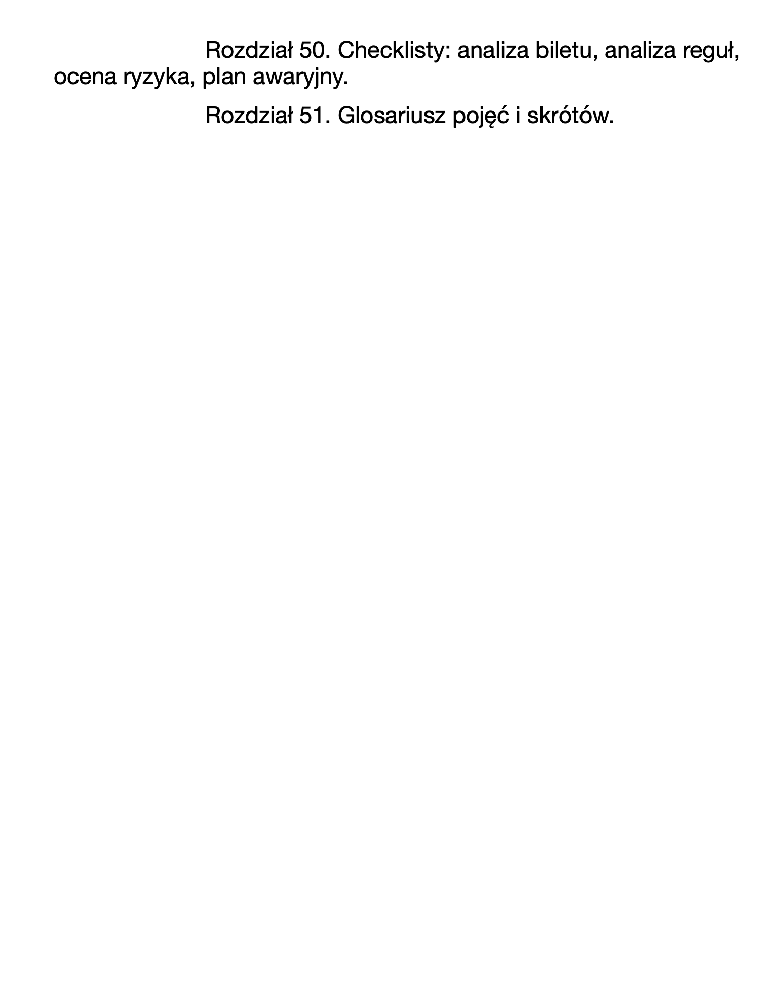 Checklisty i procedury: rozdziały, które zamieniają wiedzę w praktykę: analiza biletu, analiza reguł, ocena ryzyka, plan awaryjny.