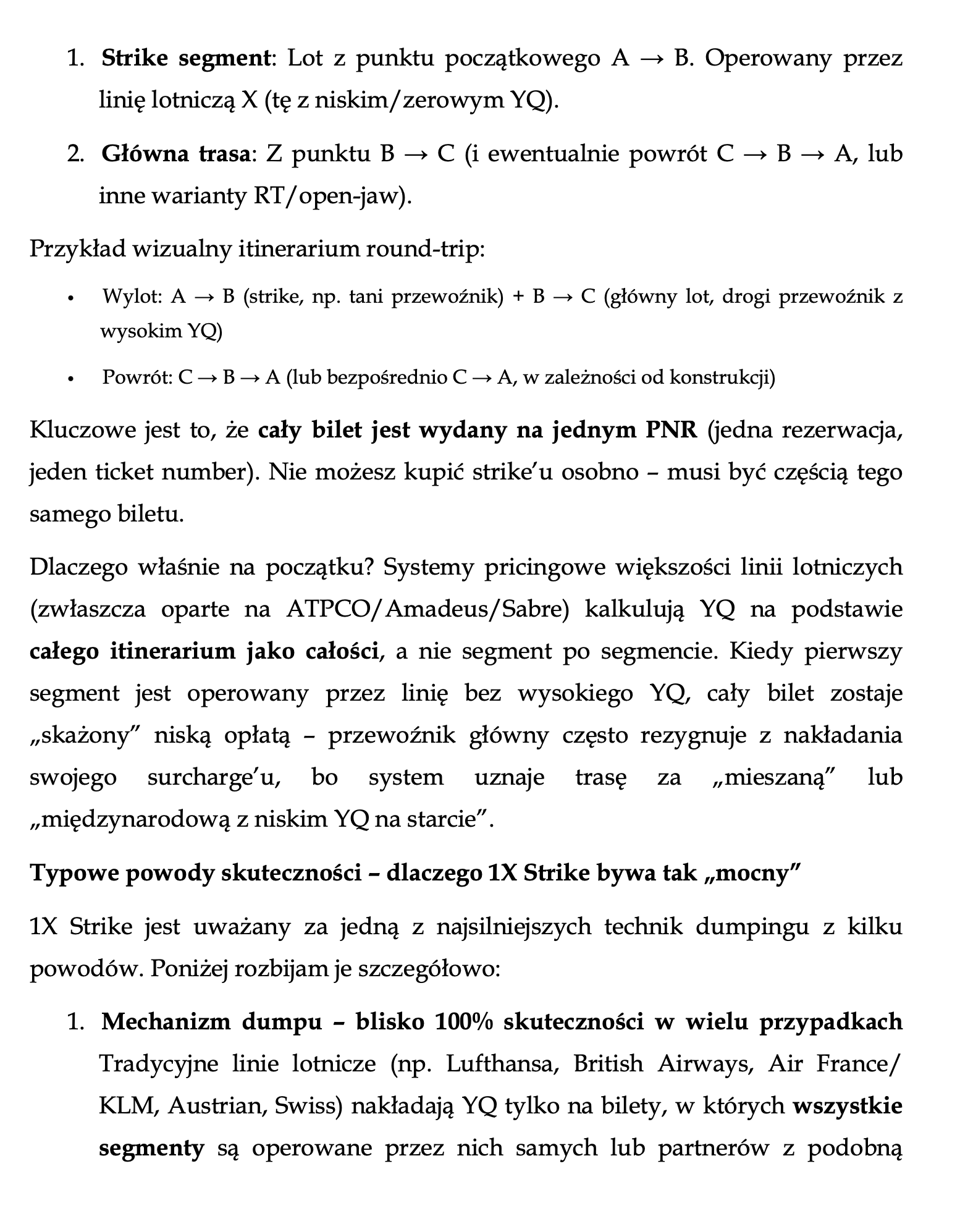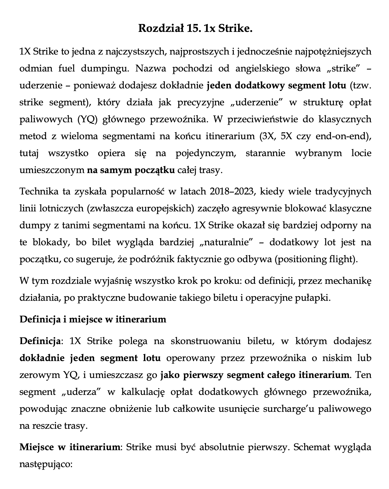 Autor omawia mechanikę „strike” – dodatkowego segmentu działającego jak przełącznik – oraz porządkuje rodzinę technik określanych skrótowo jako 1X, 2X, 3X, 4X+ i kolejne warianty. Najważniejsze jest jednak to, że nie zatrzymuje się na samych nazwach. Pokazuje, kiedy dany wariant ma sens, kiedy jest pułapką, i jak odróżnić prawdziwy efekt na dopłatach od sytuacji, w której system po prostu znalazł inną taryfę.