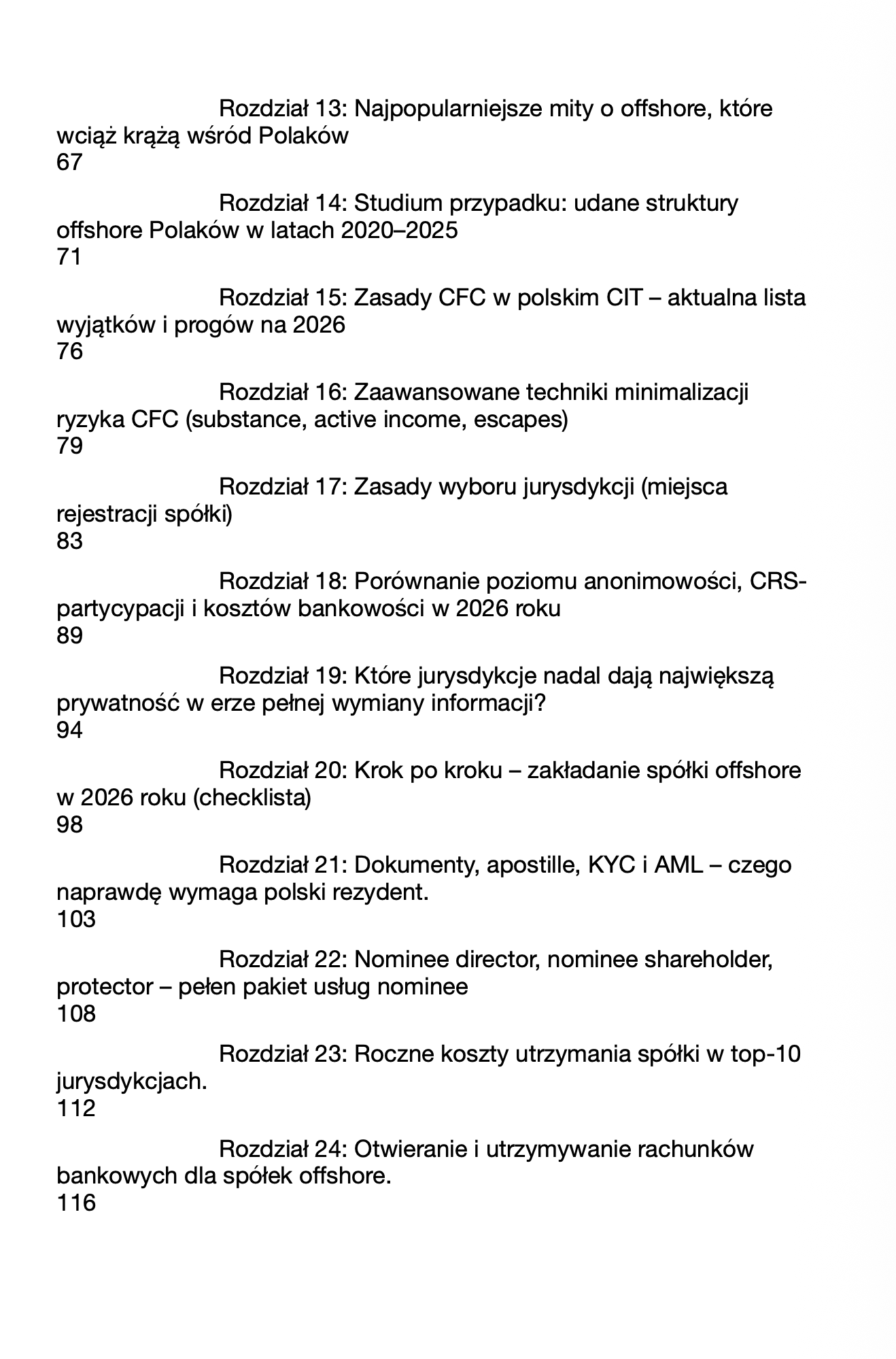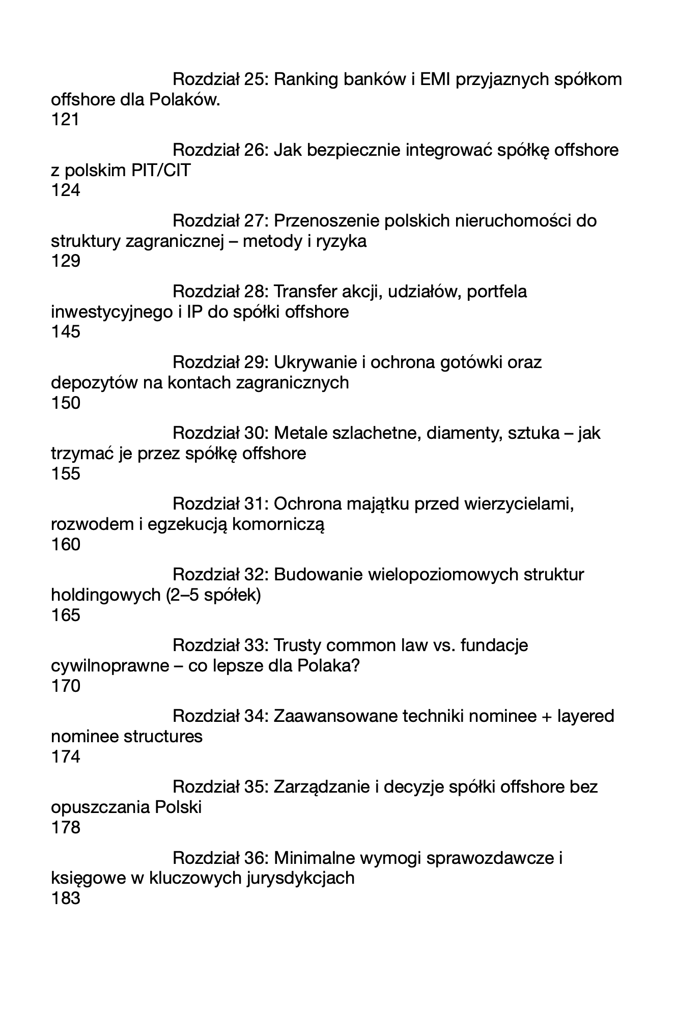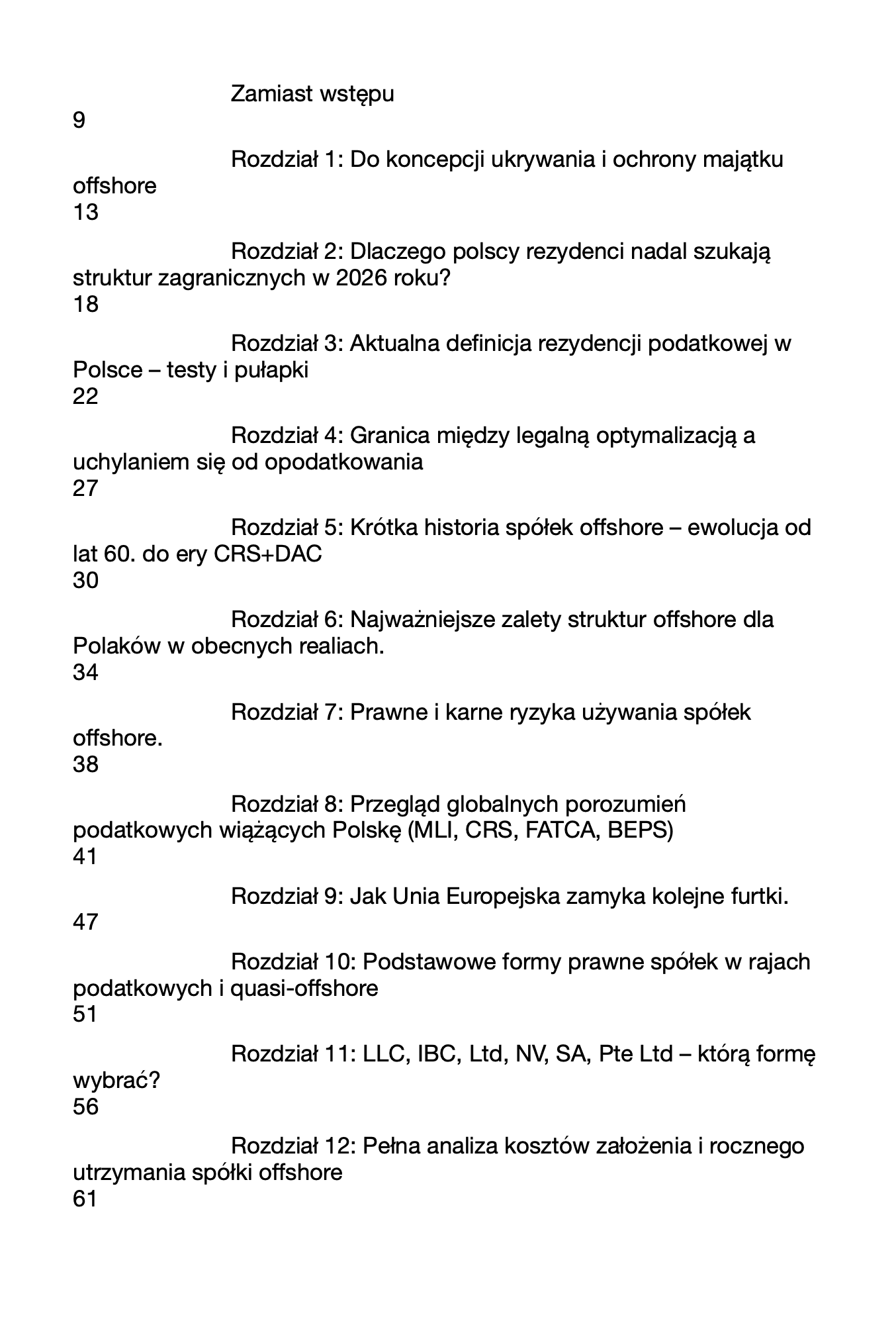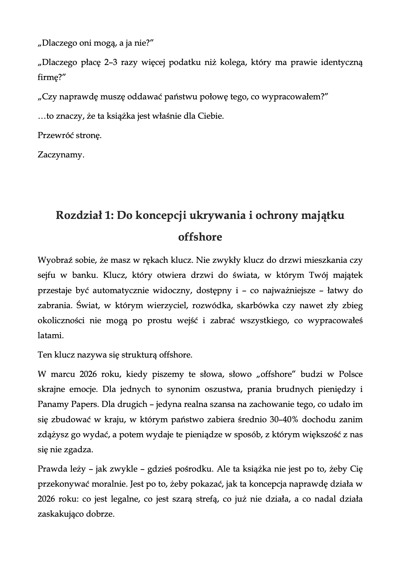 Ta książka to najostrzejszy, najbardziej aktualny (marzec 2026) i bezkompromisowy przewodnik po prawdziwym ukrywaniu majątku za pomocą spółek offshore. Ten praktyczny podręcznik zabierze Cię krok po kroku przez cały proces legalnego ukrywania majątku. Pokazuje dokładnie, jak w realiach 2026 roku (mimo CRS, FATCA, JPK_CIT, SAF-CIT, klauzuli GAAR i nowych zasad CFC) całkowicie odciąć polski fiskus od Twoich pieniędzy, nieruchomości, kryptowalut, portfela inwestycyjnego, IP i oszczędności.
