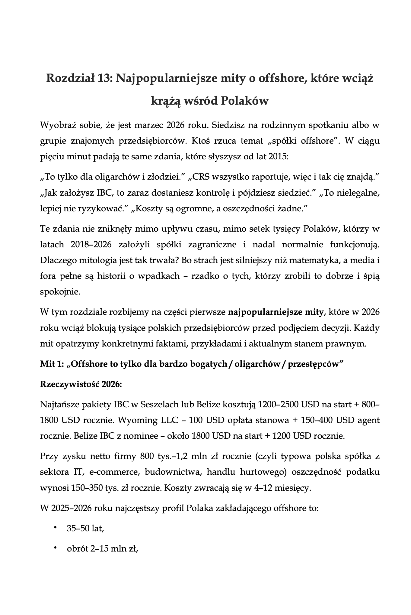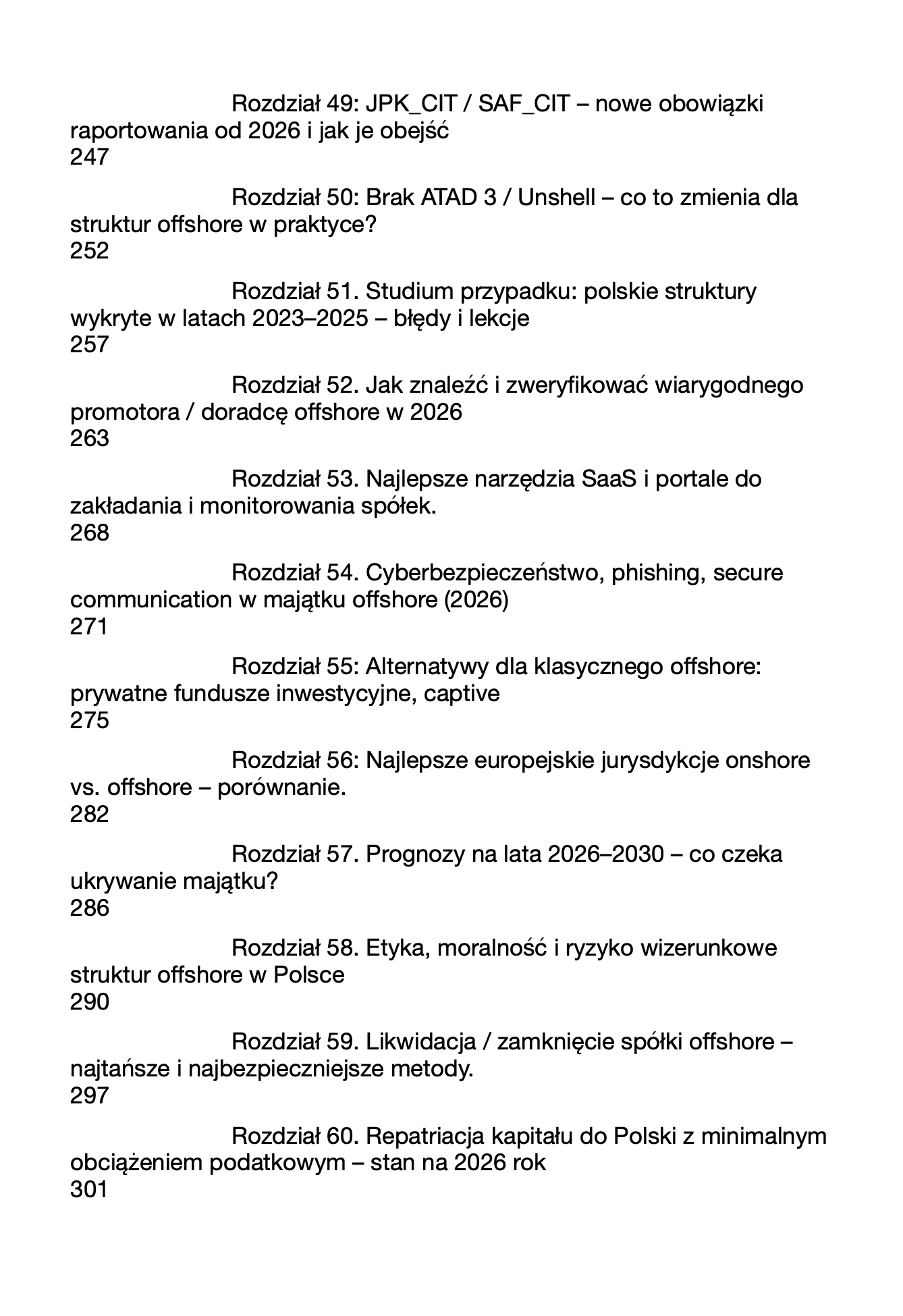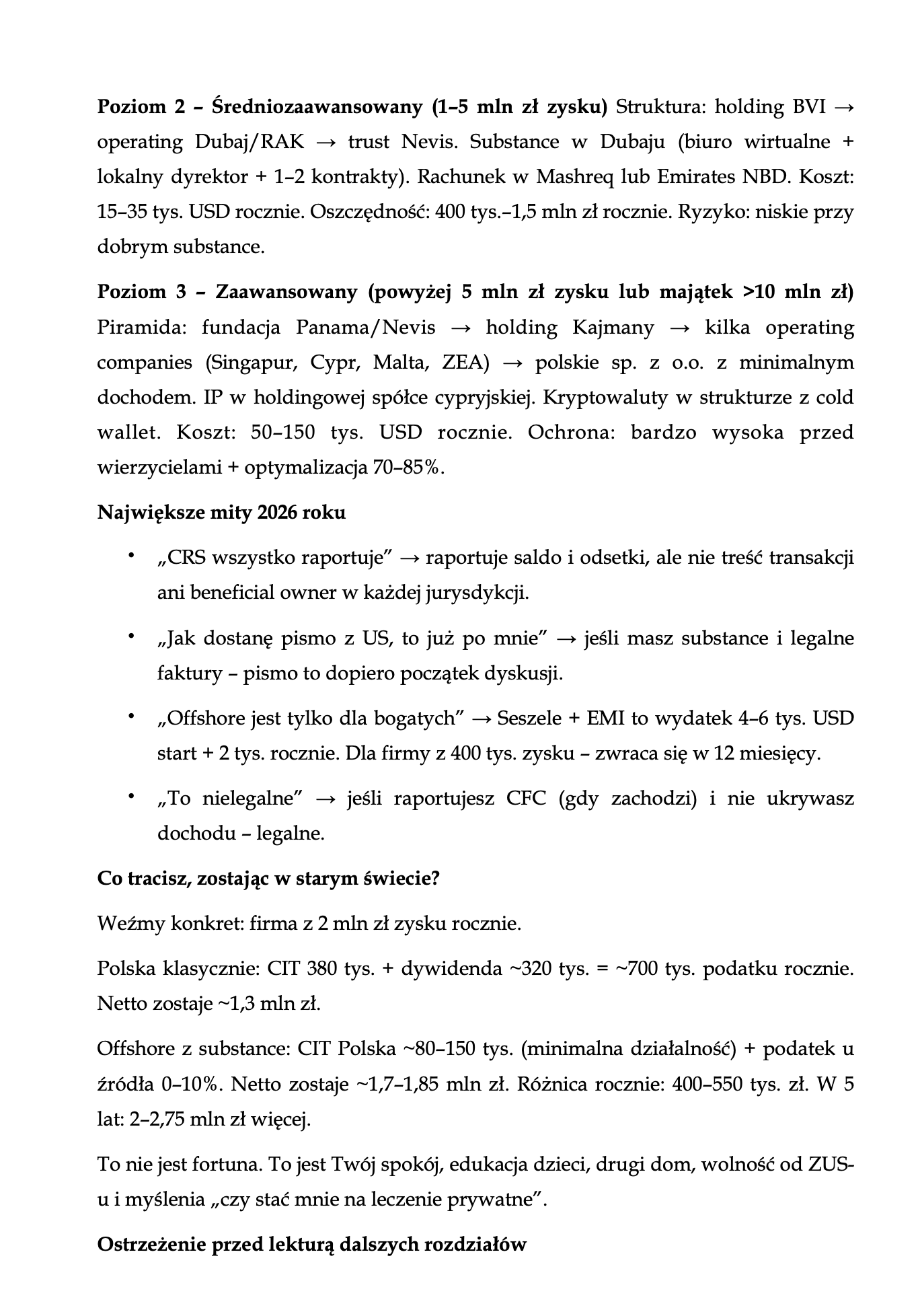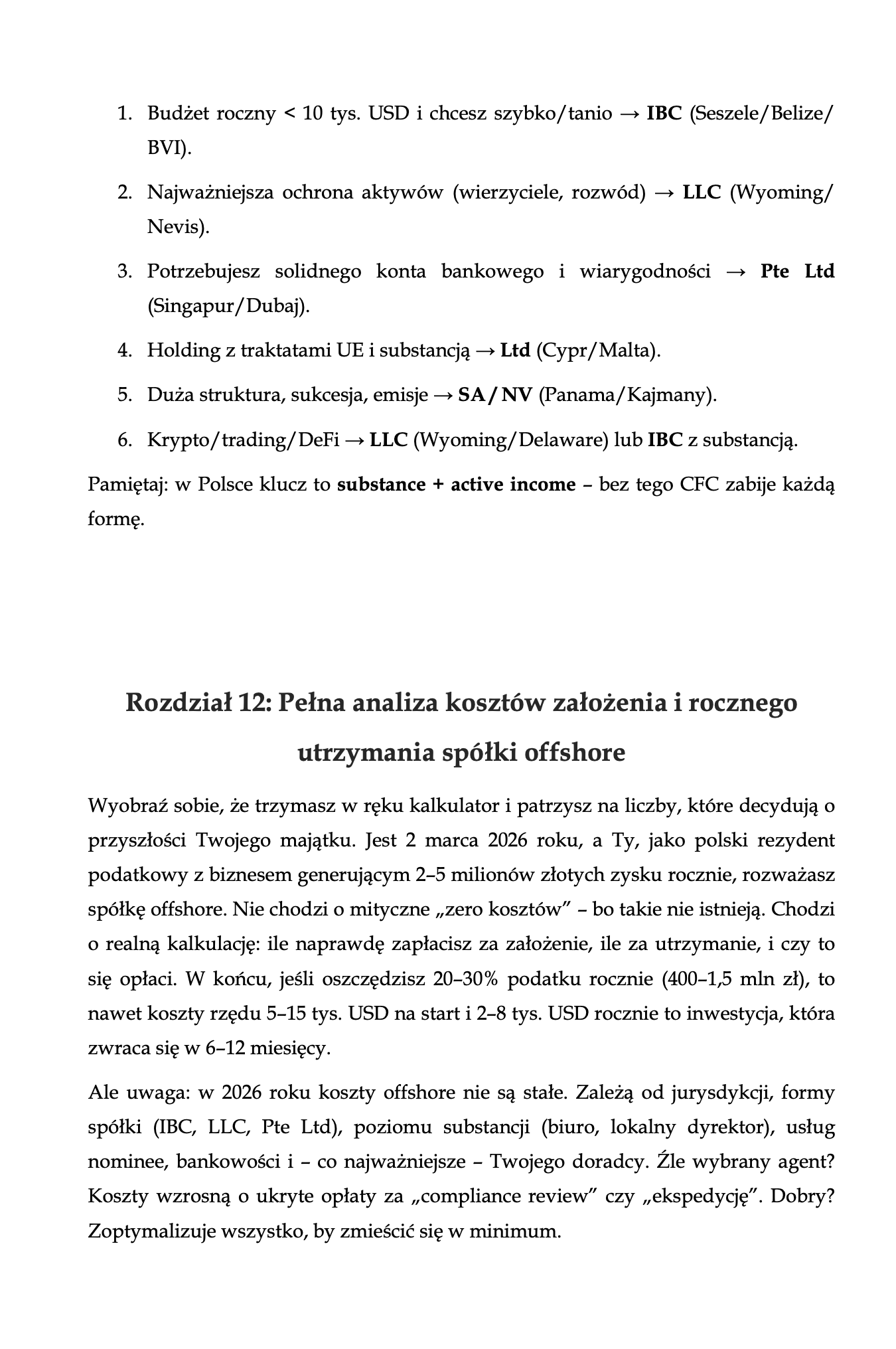 Ta książka to najostrzejszy, najbardziej aktualny (marzec 2026) i bezkompromisowy przewodnik po prawdziwym ukrywaniu majątku za pomocą spółek offshore. Ten praktyczny podręcznik zabierze Cię krok po kroku przez cały proces legalnego ukrywania majątku. Pokazuje dokładnie, jak w realiach 2026 roku (mimo CRS, FATCA, JPK_CIT, SAF-CIT, klauzuli GAAR i nowych zasad CFC) całkowicie odciąć polski fiskus od Twoich pieniędzy, nieruchomości, kryptowalut, portfela inwestycyjnego, IP i oszczędności.