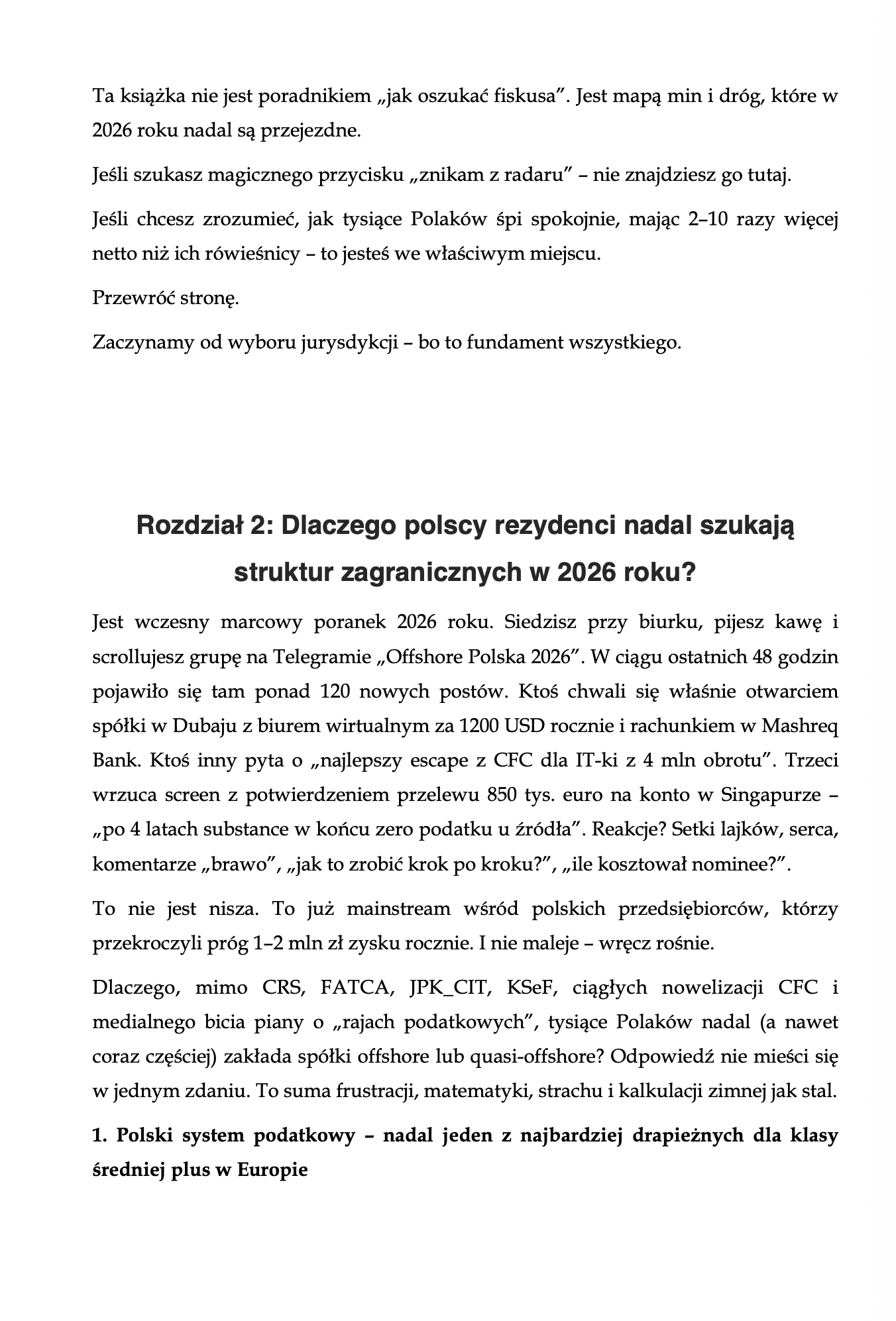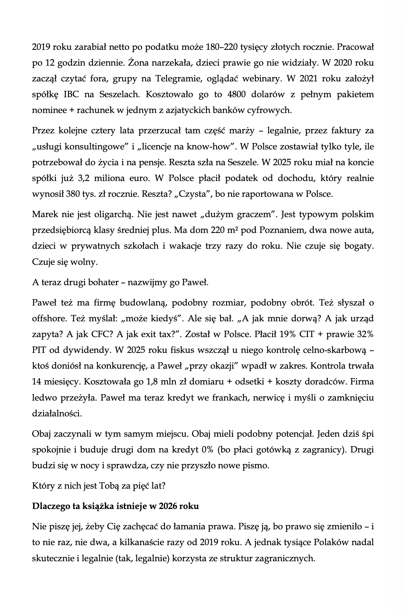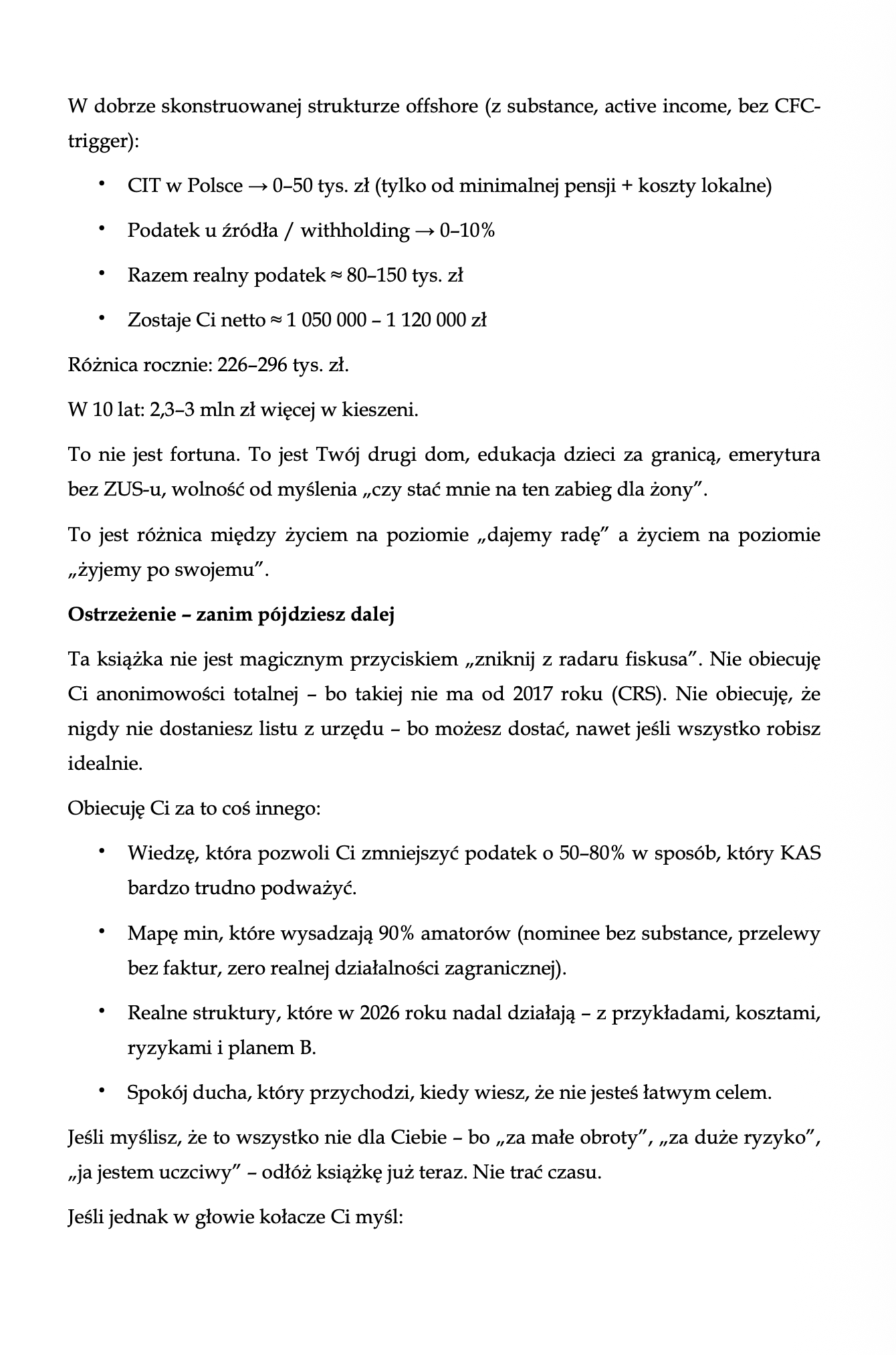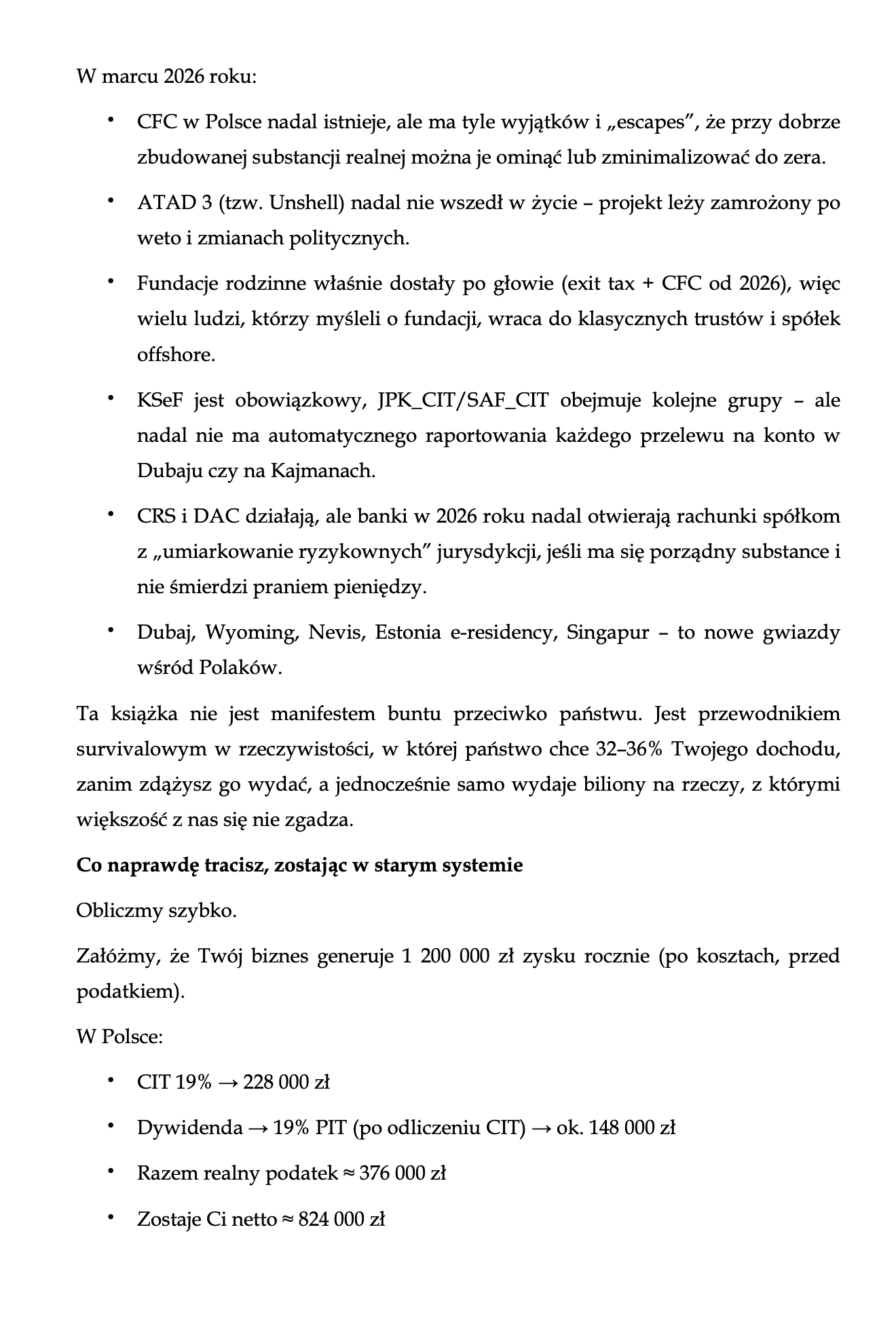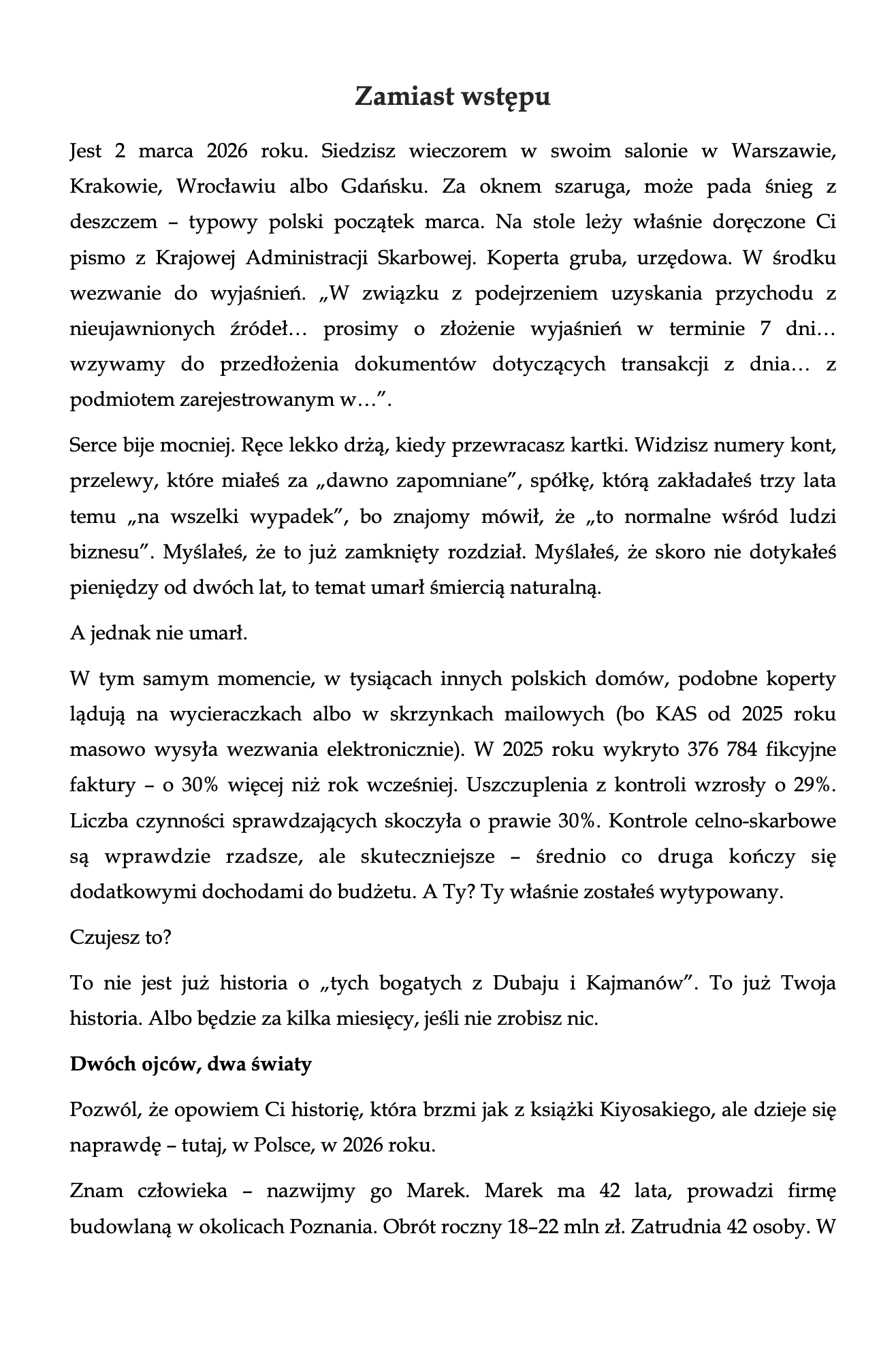 Jeśli masz firmę z zyskiem powyżej 500 tys. zł rocznie i chcesz, żeby Twój majątek przestał być łatwym celem – to jest dokładnie ta książka. Nie obiecuje magii ani całkowitej anonimowości (bo CRS tego nie pozwala), ale daje Ci realną mapę, dzięki której tysiące przedsiębiorców już dziś śpi spokojnie, mając większość majątku poza zasięgiem polskiego systemu.