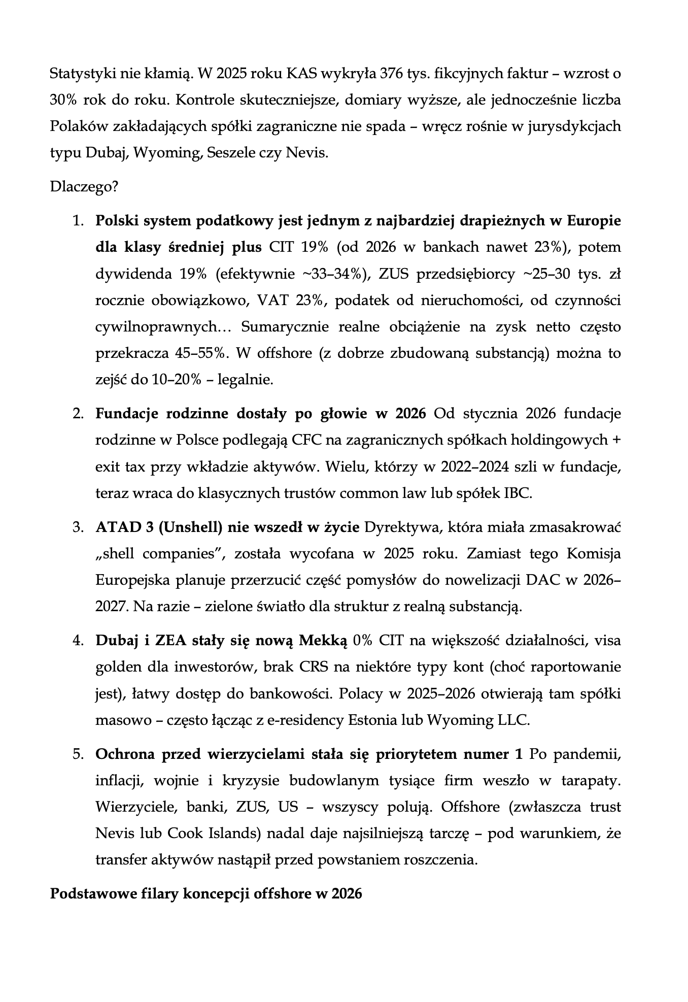 Nie ma go już w JPK_CIT, nie widać w CRS, nie da się go zająć komornikiem, byłą żoną ani jednym pismem z KAS. Miliony złotych leżą bezpiecznie na kontach spółek w Dubaju, Wyoming, Nevis czy Seszelach, a Ty w Polsce nadal prowadzisz firmę, płacisz tylko to, co absolutnie musisz, i śpisz spokojnie każdej nocy. Żadnych czerwonych flag, żadnych wezwań do wyjaśnień, żadnych niespodziewanych kontroli. Twój majątek jest po prostu niewidoczny dla polskiego systemu.
