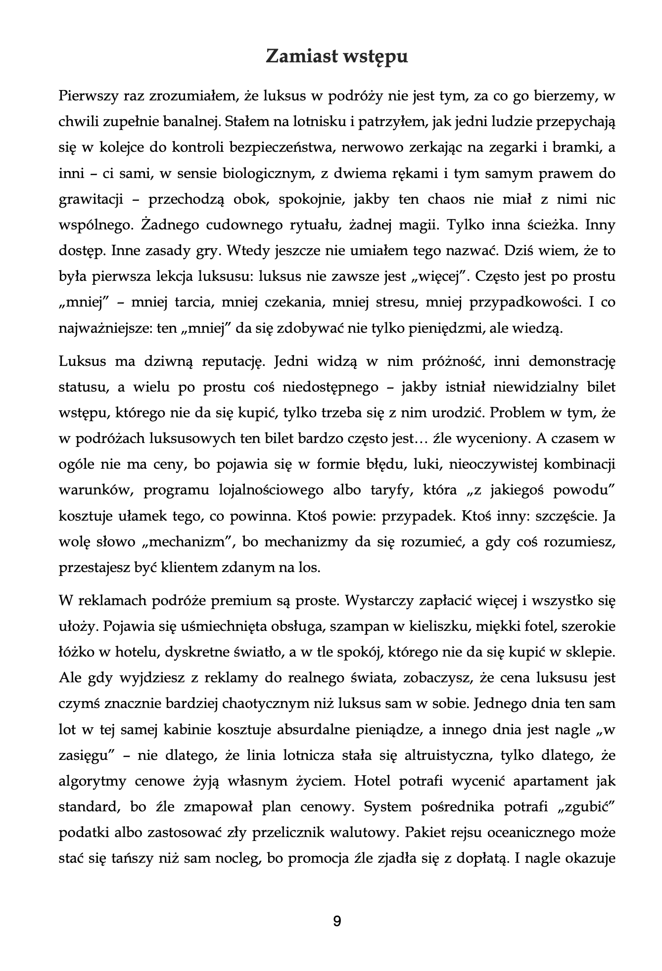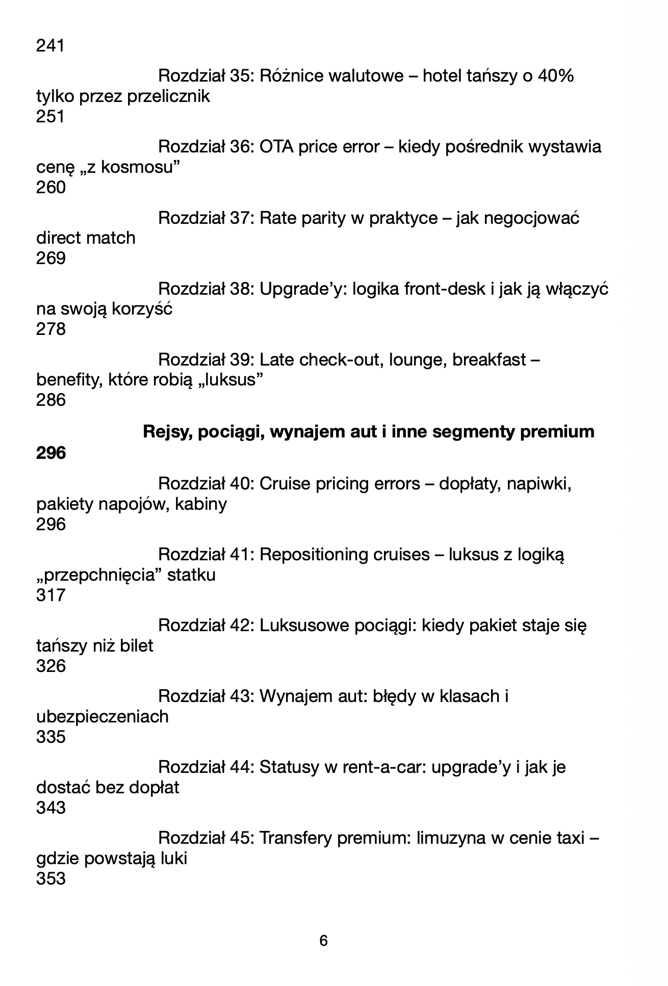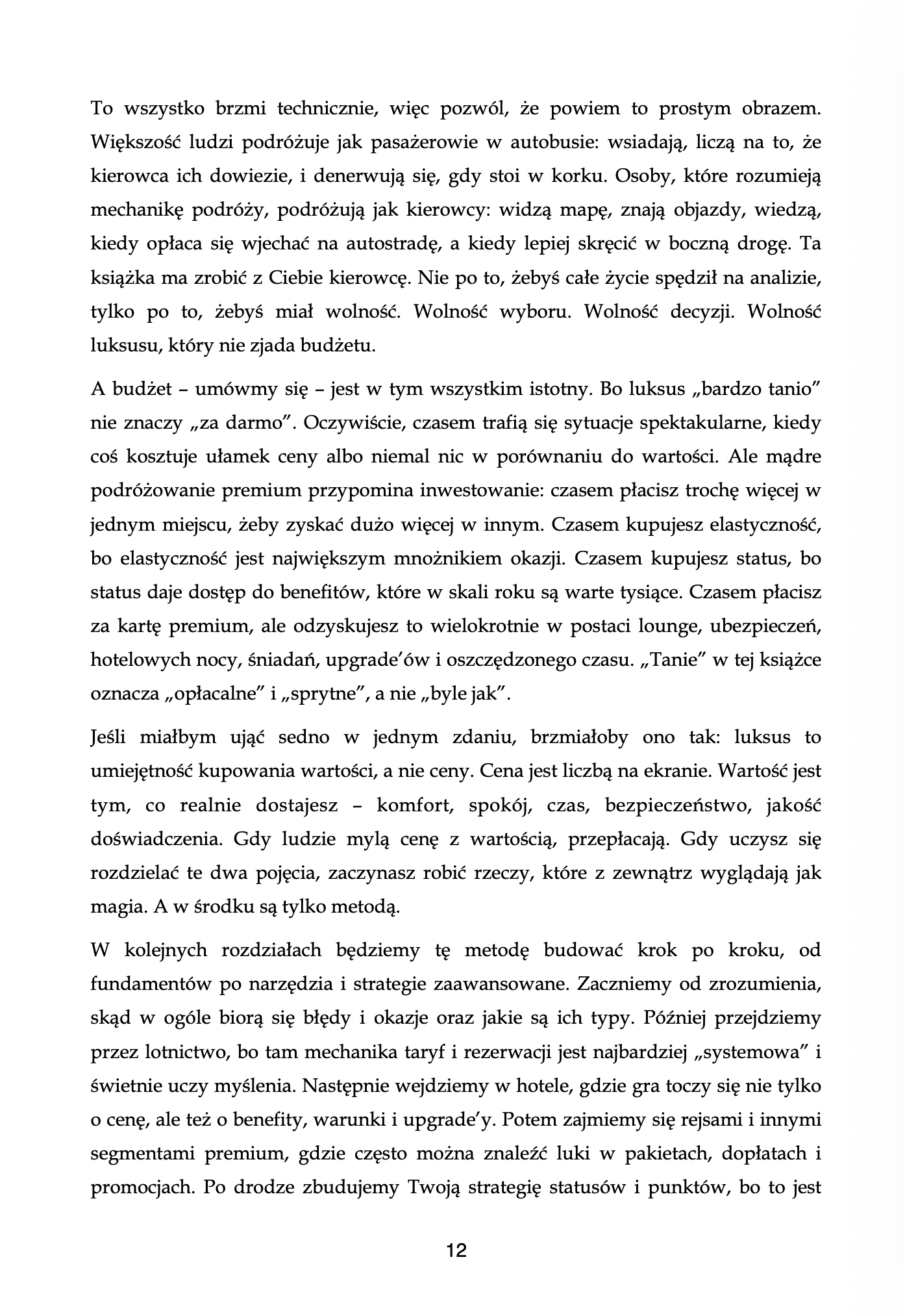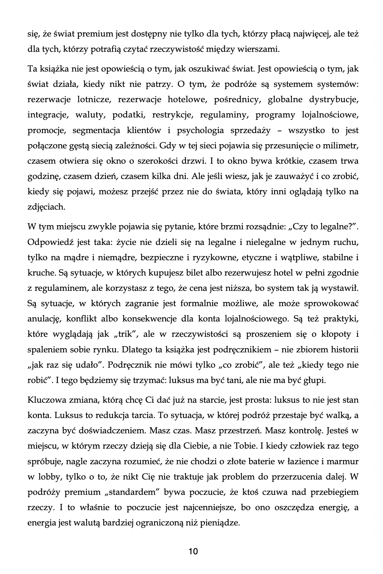 Niekoniecznie. I właśnie to pokazuje ta książka. Nie w formie pustych obietnic, bajek o „sekretnych trikach” ani internetowych legend, ale w formie konkretnego, rozbudowanego podręcznika, który odsłania mechanikę rynku podróży premium. Autor pokazuje, że luksus w praktyce bardzo często nie polega na wydawaniu większych pieniędzy, lecz na rozumieniu systemu lepiej niż inni. Bo w świecie lotów, hoteli, rejsów, statusów i programów lojalnościowych cena bardzo często nie jest odbiciem realnej wartości. Bywa skutkiem błędu, luki, złego mapowania taryfy, różnicy kursowej, źle połączonej promocji albo przewagi tych, którzy wiedzą, gdzie patrzeć i jak działać.