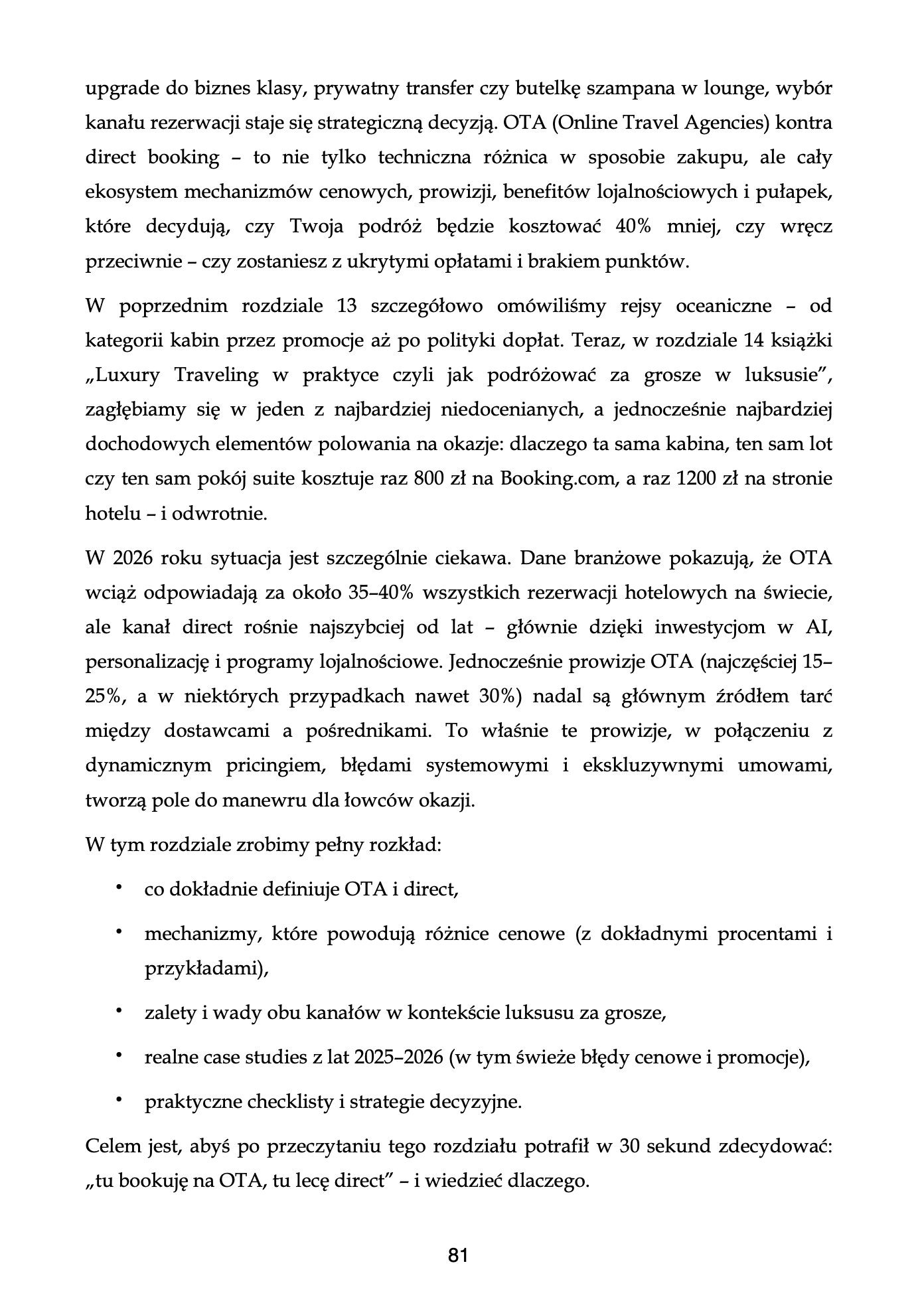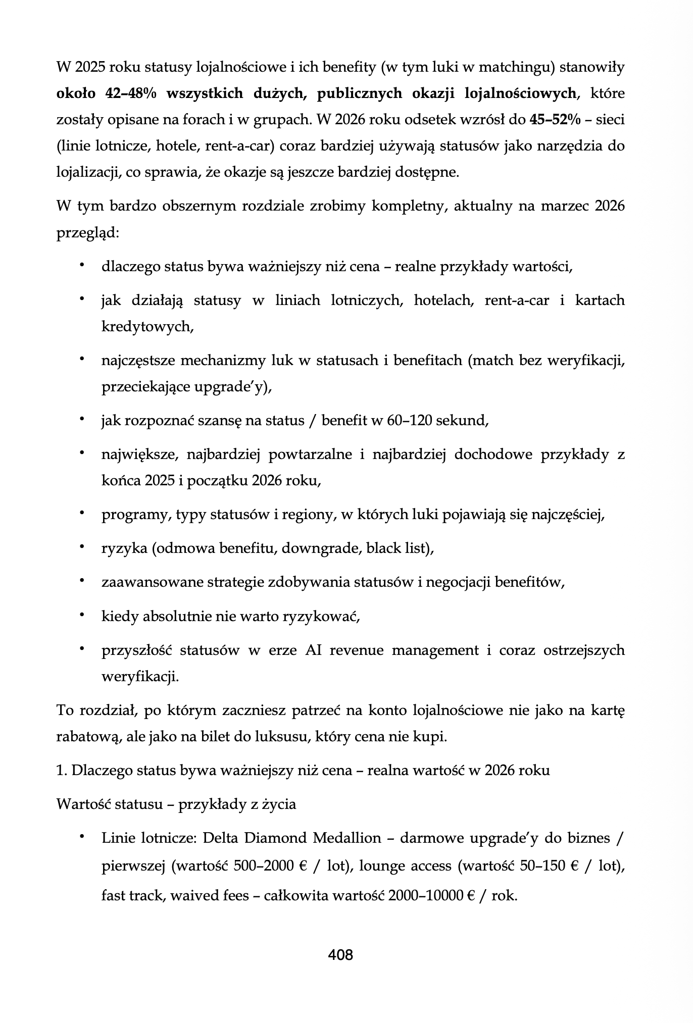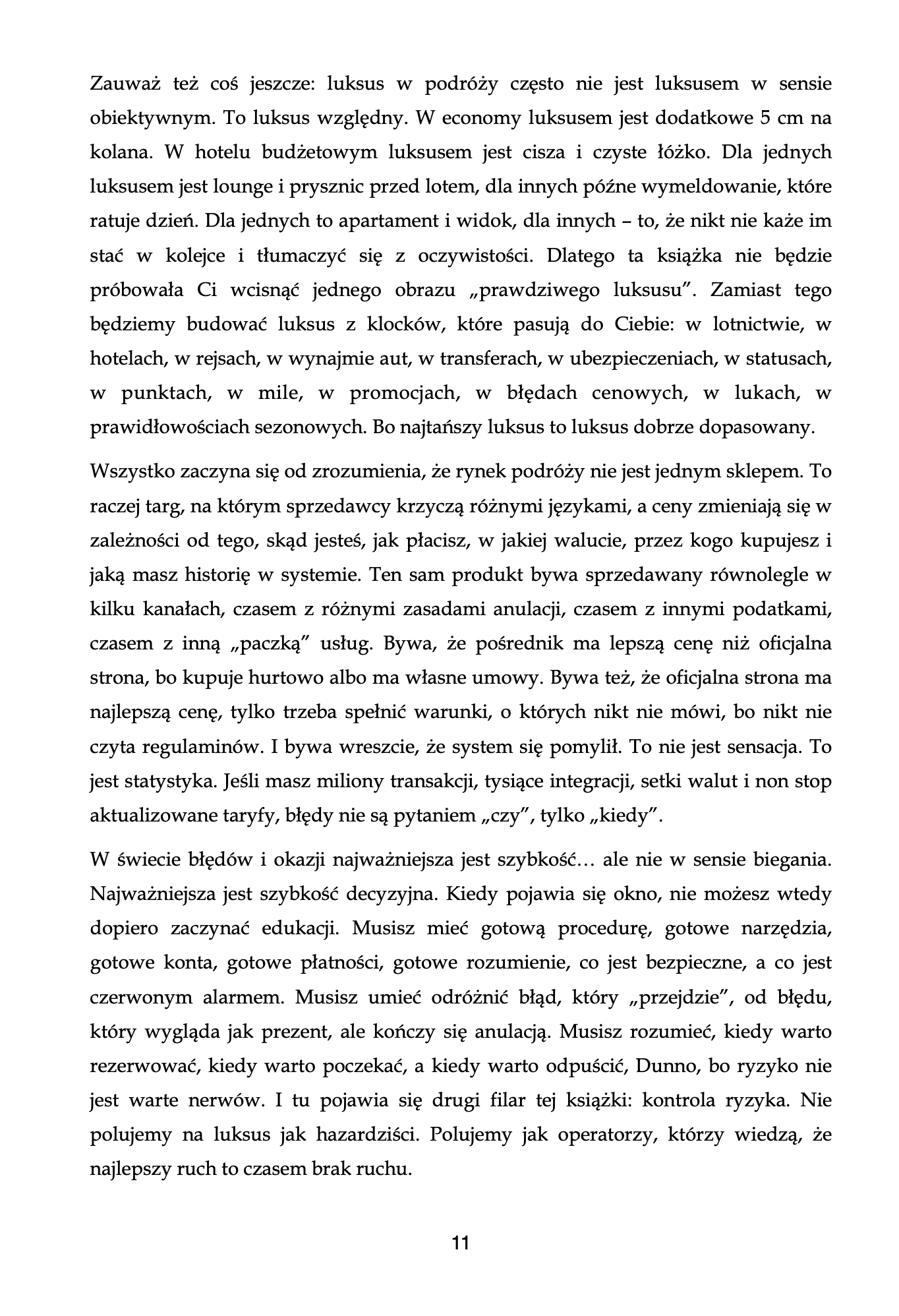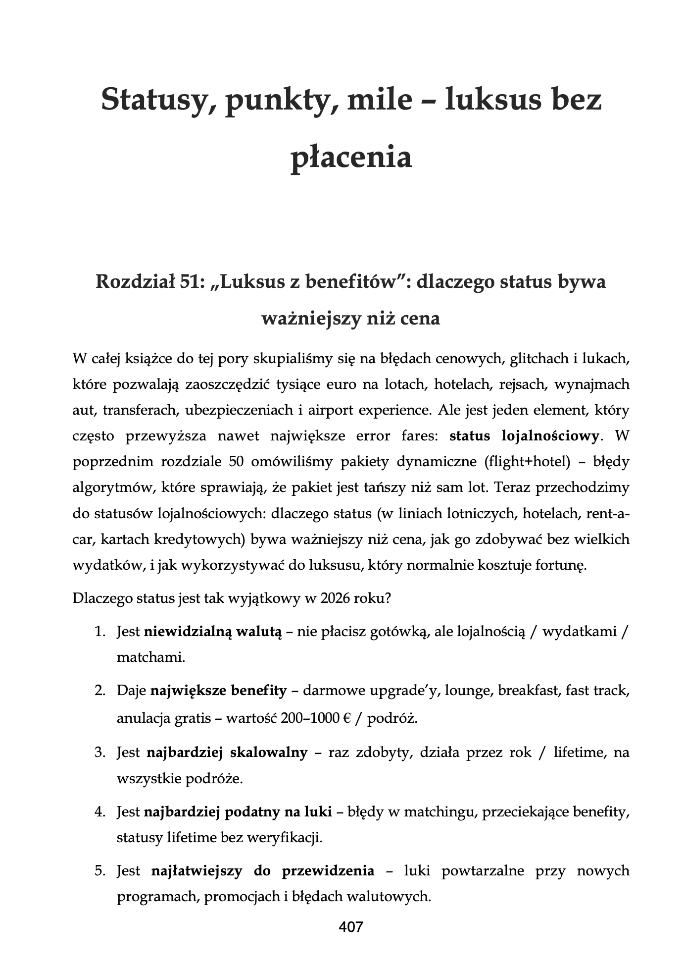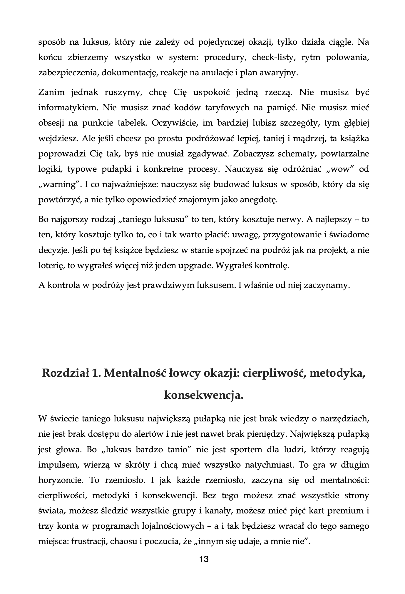 Niekoniecznie. I właśnie to pokazuje ta książka. Nie w formie pustych obietnic, bajek o „sekretnych trikach” ani internetowych legend, ale w formie konkretnego, rozbudowanego podręcznika, który odsłania mechanikę rynku podróży premium. Autor pokazuje, że luksus w praktyce bardzo często nie polega na wydawaniu większych pieniędzy, lecz na rozumieniu systemu lepiej niż inni. Bo w świecie lotów, hoteli, rejsów, statusów i programów lojalnościowych cena bardzo często nie jest odbiciem realnej wartości. Bywa skutkiem błędu, luki, złego mapowania taryfy, różnicy kursowej, źle połączonej promocji albo przewagi tych, którzy wiedzą, gdzie patrzeć i jak działać.