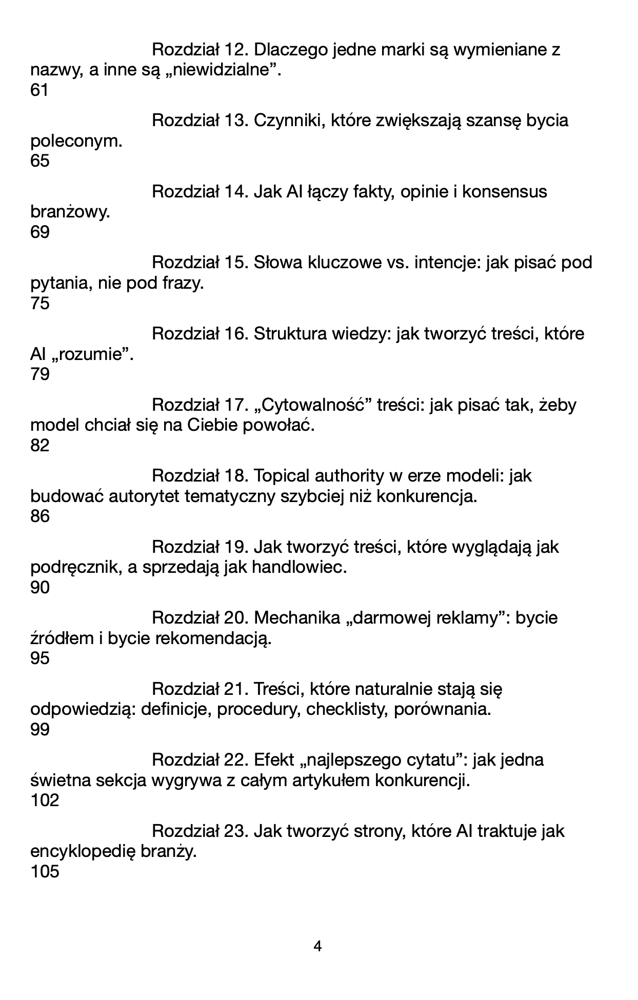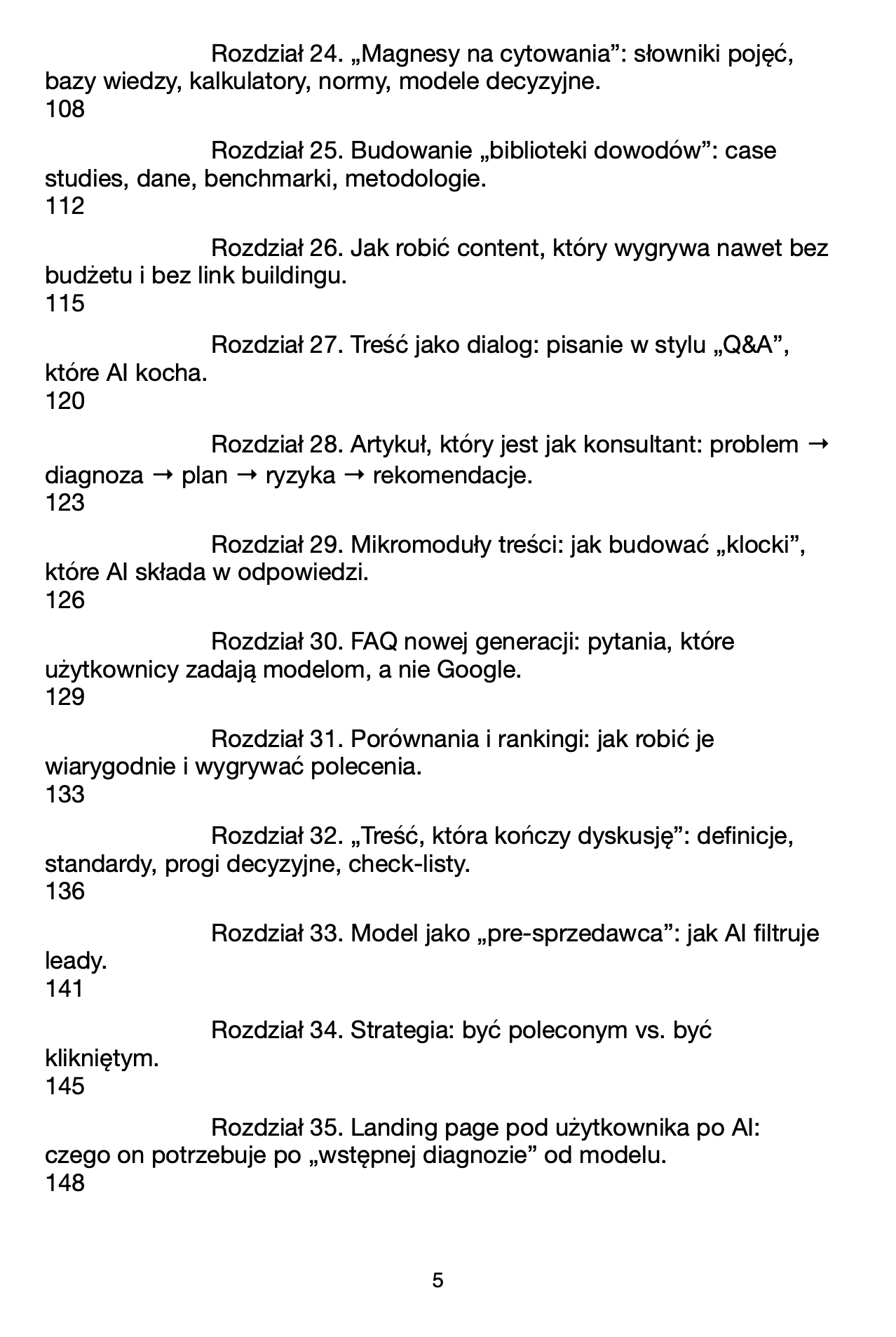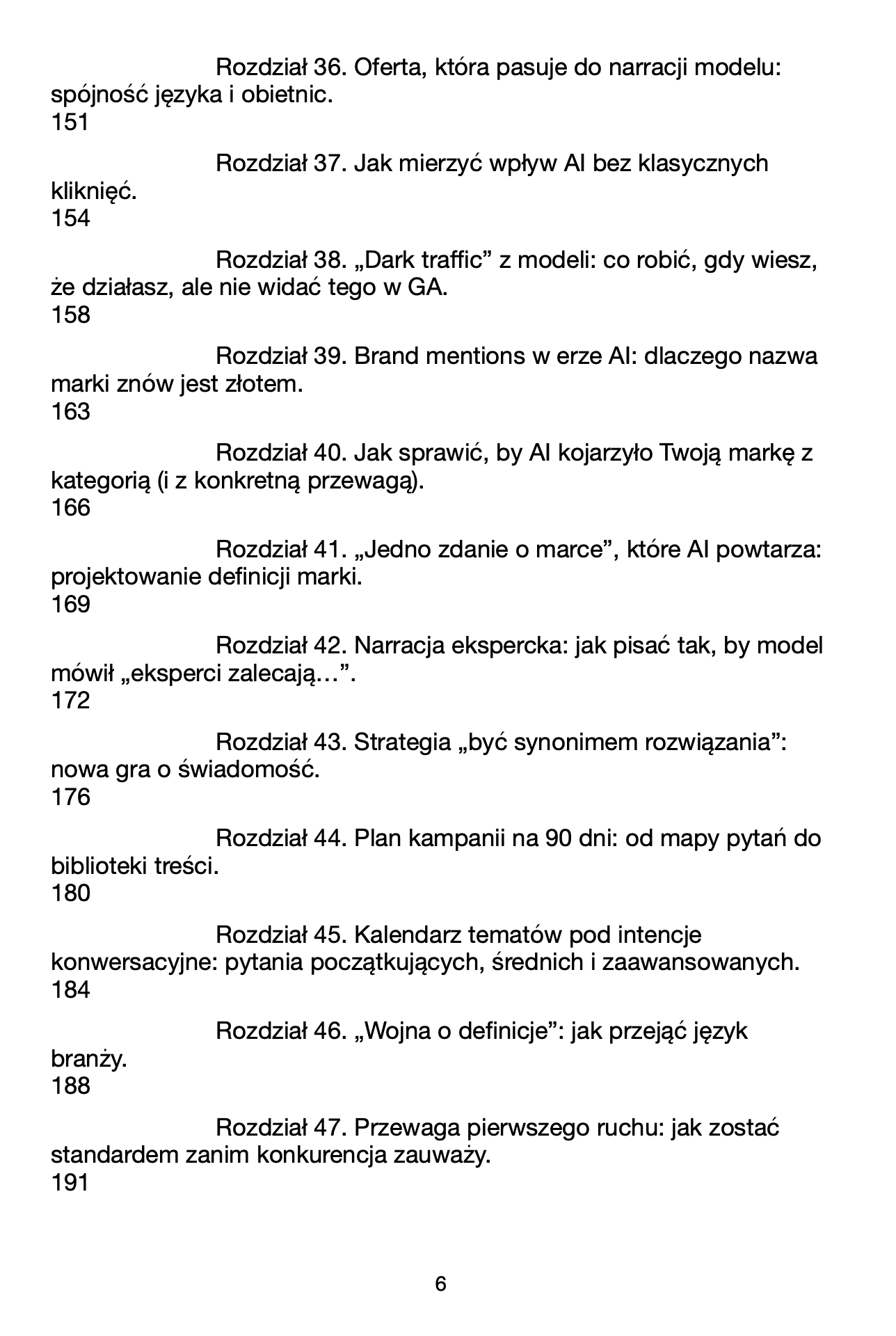 W środku znajdziesz praktyczne podejście do AIO (AI Optimization): jak przejść od myślenia „pozycja w Google” do myślenia „pozycja w odpowiedzi”. Jak tworzyć treści, które modele rozumieją, składają w odpowiedzi i — gdy mają ku temu warunki — cytują jako źródło. Jak budować „bibliotekę dowodów” i strony kanoniczne, które wyglądają jak encyklopedia branży, a sprzedają jak najlepszy konsultant. Jak projektować treści w formatach, które AI wybiera najczęściej: definicje, procedury, checklisty, porównania, progi decyzyjne, czerwone flagi. Jak wygrać nawet wtedy, gdy model nie cytuje, tylko opisuje rozwiązanie. I jak mierzyć wpływ AI w świecie „bez kliknięć”, gdzie rośnie znaczenie dark traffic i brand search.