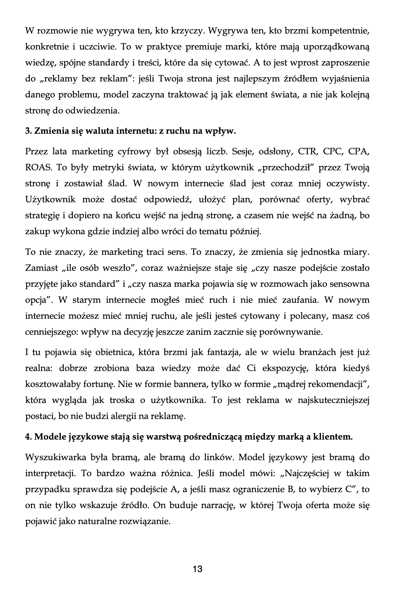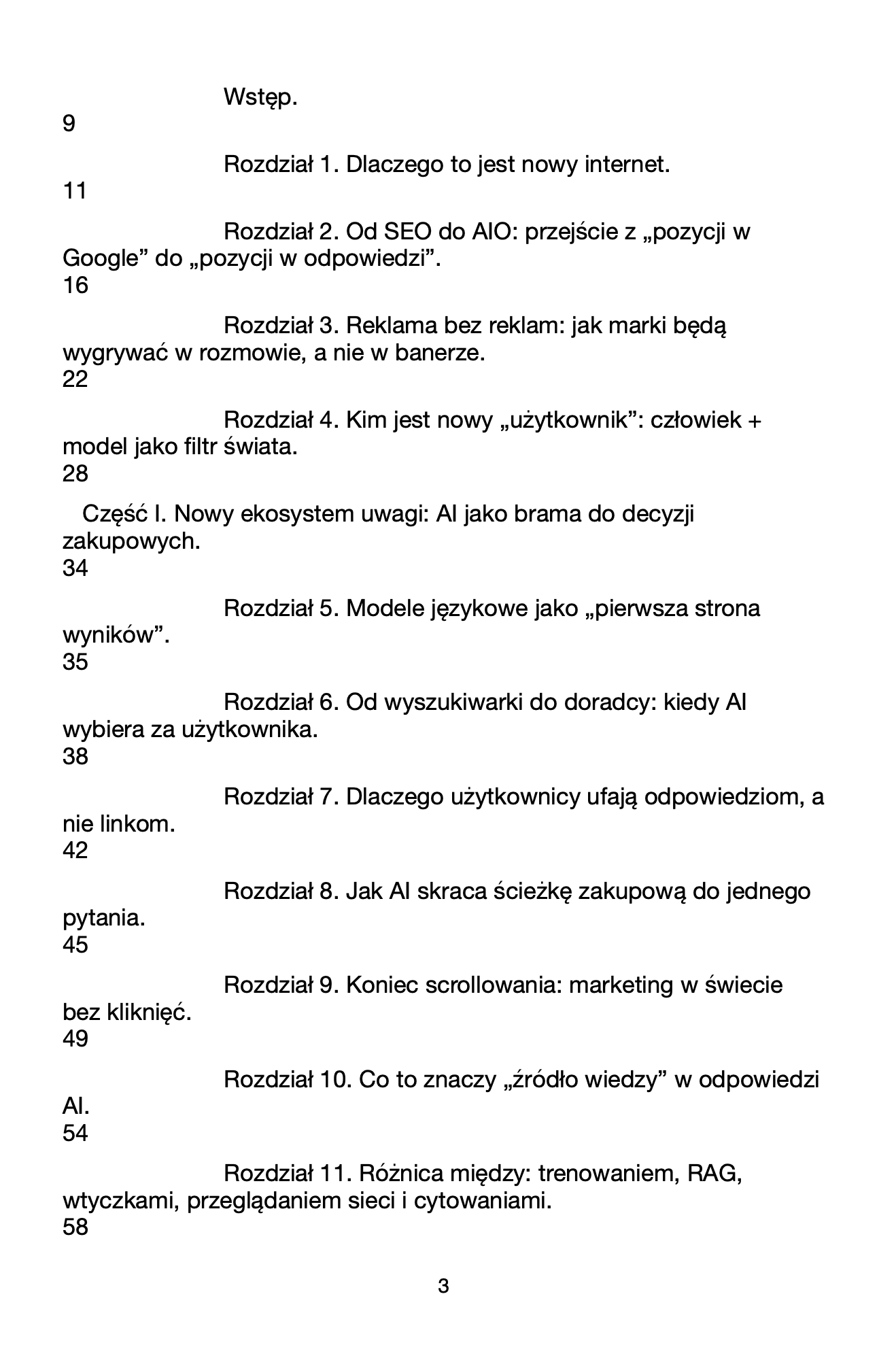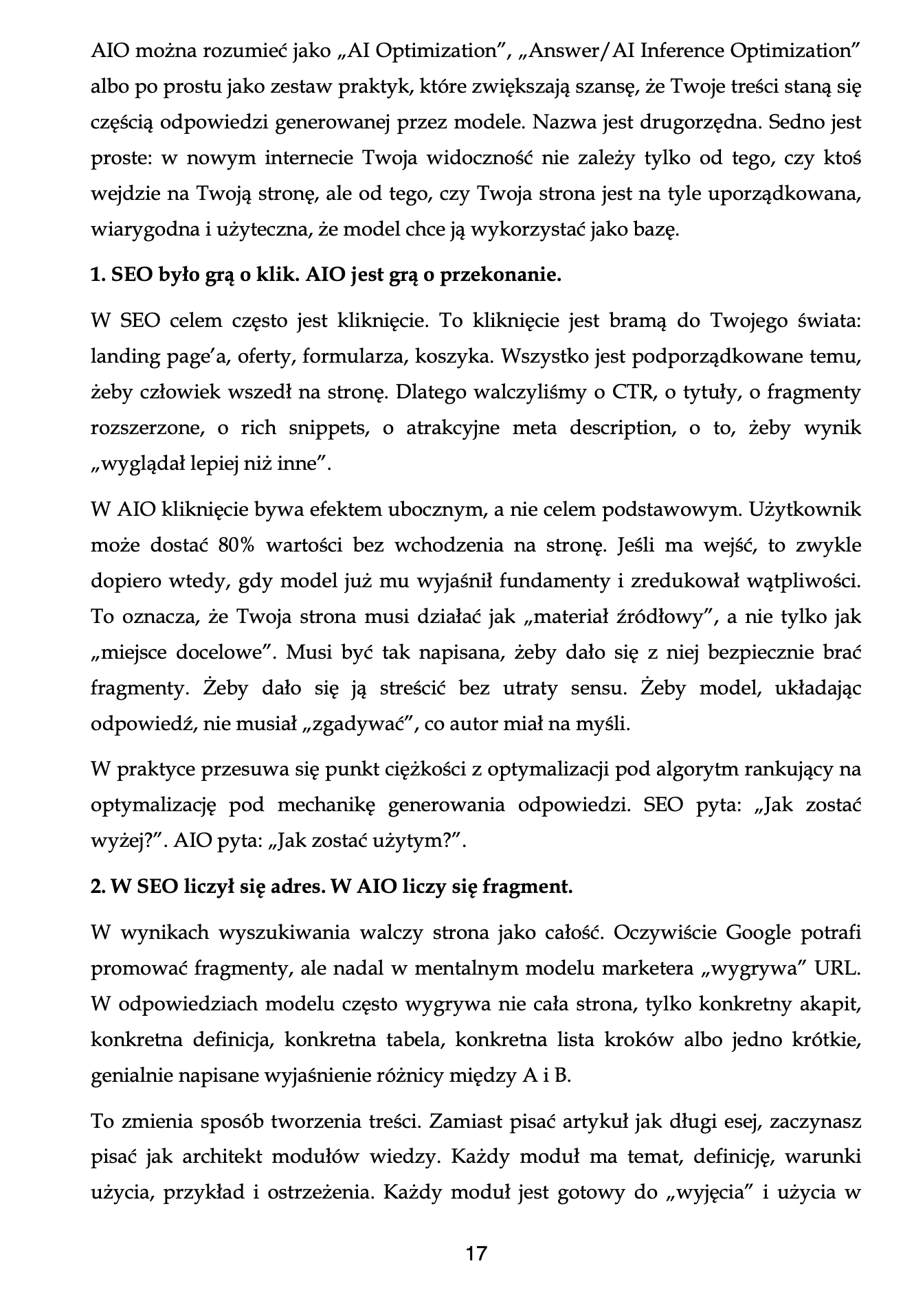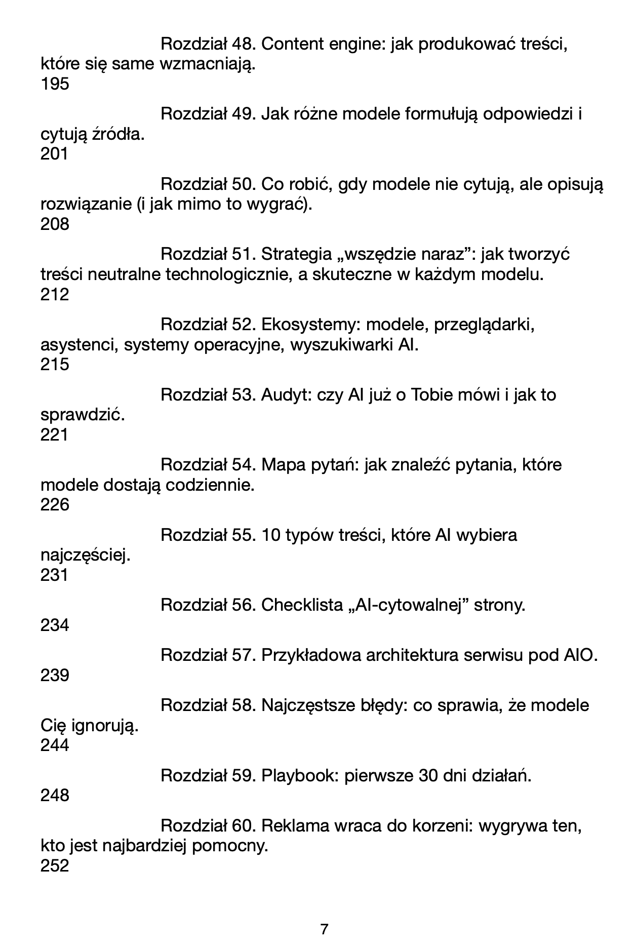 W środku znajdziesz praktyczne podejście do AIO (AI Optimization): jak przejść od myślenia „pozycja w Google” do myślenia „pozycja w odpowiedzi”. Jak tworzyć treści, które modele rozumieją, składają w odpowiedzi i — gdy mają ku temu warunki — cytują jako źródło. Jak budować „bibliotekę dowodów” i strony kanoniczne, które wyglądają jak encyklopedia branży, a sprzedają jak najlepszy konsultant. Jak projektować treści w formatach, które AI wybiera najczęściej: definicje, procedury, checklisty, porównania, progi decyzyjne, czerwone flagi. Jak wygrać nawet wtedy, gdy model nie cytuje, tylko opisuje rozwiązanie. I jak mierzyć wpływ AI w świecie „bez kliknięć”, gdzie rośnie znaczenie dark traffic i brand search.