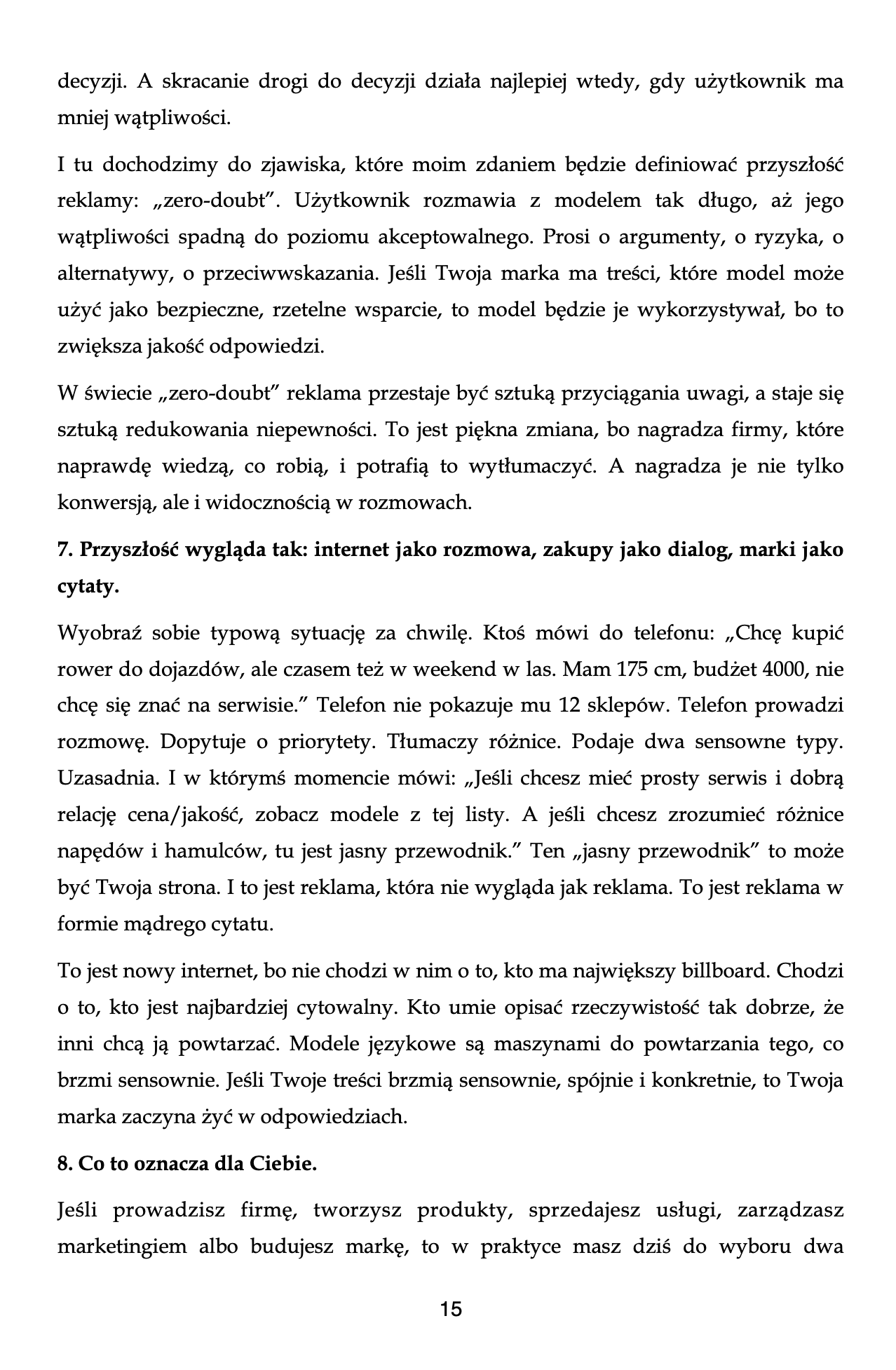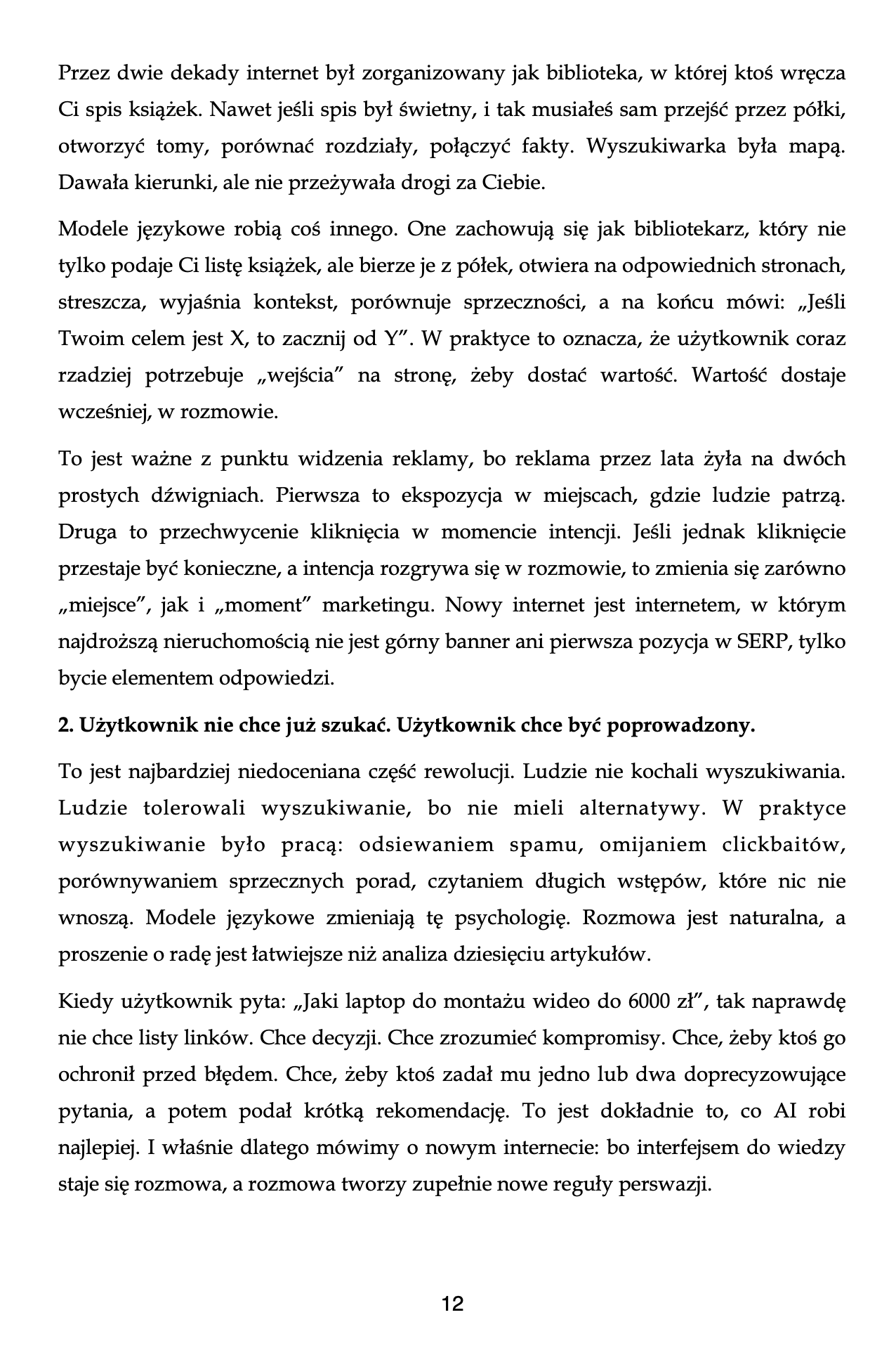 Reklama w modelach językowych AI. to książka o nowym internecie, w którym użytkownik coraz częściej nie przewija wyników, nie porównuje dziesięciu zakładek i nie „szuka informacji” w klasyczny sposób. Zamiast tego zadaje jedno pytanie i oczekuje jednej, sensownej odpowiedzi. A tę odpowiedź daje model językowy. ChatGPT, DeepSeek, Mistral, Gemini i inne systemy przestają być ciekawostką technologiczną. Stają się bramą do decyzji zakupowych, filtrem świata i nową „pierwszą stroną wyników”. W takim świecie reklama nie znika. Zmienia formę: przestaje być banerem, a staje się rekomendacją, definicją, standardem i najlepszą odpowiedzią.